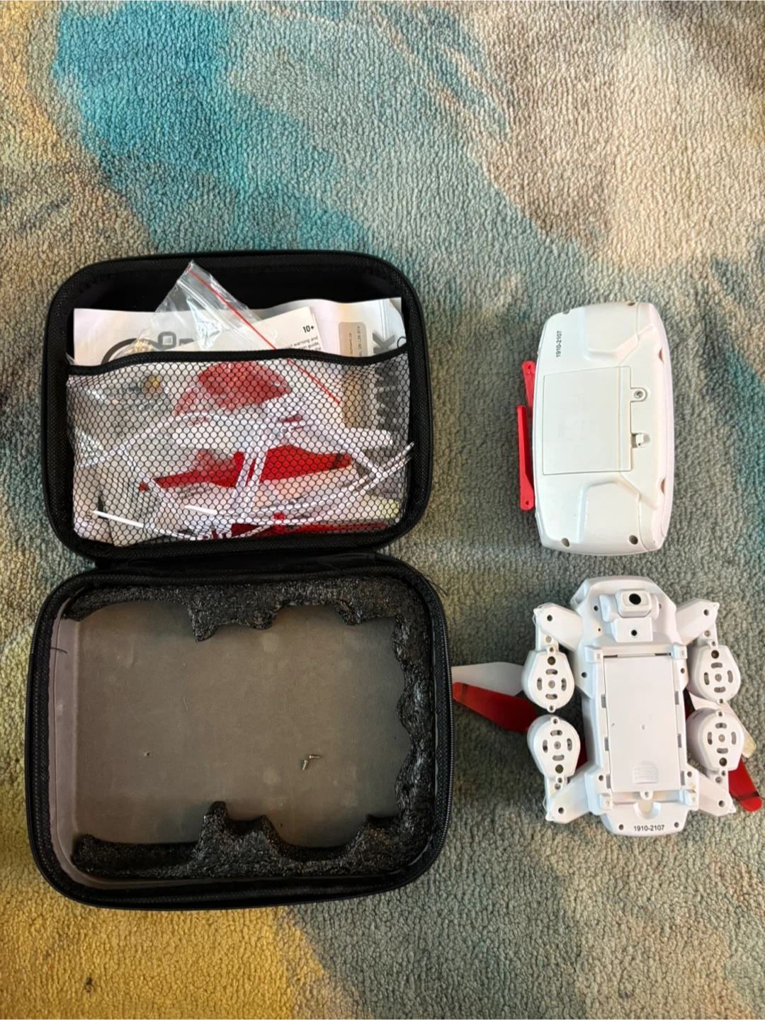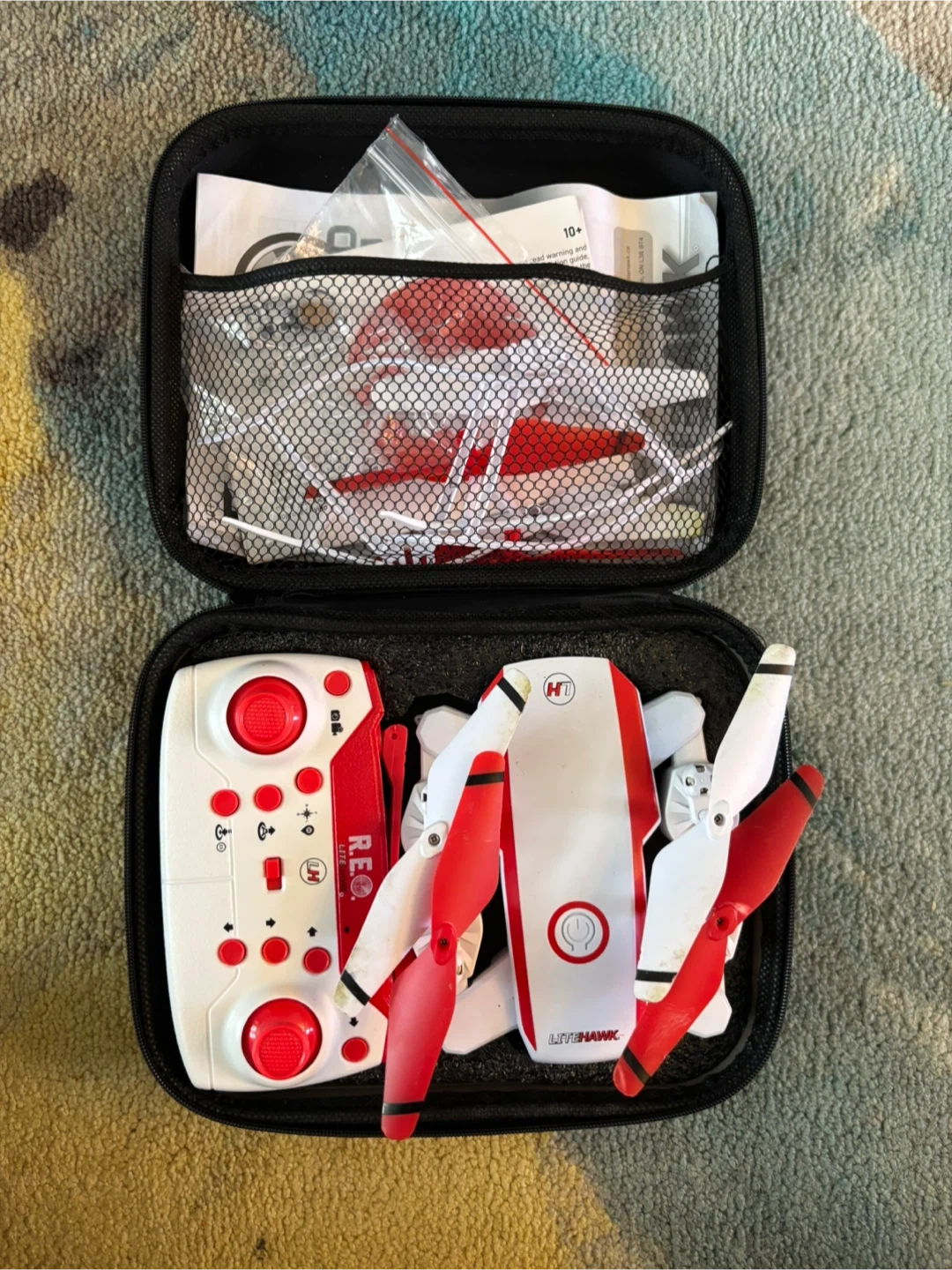 Selling a LiteHawk R.E.O. HD Drone in white and red. It comes with its case and all included accessories. The drone is in good condition and ready for some fun flights!