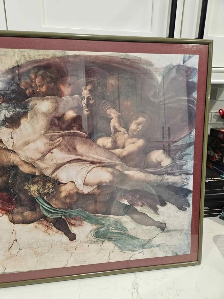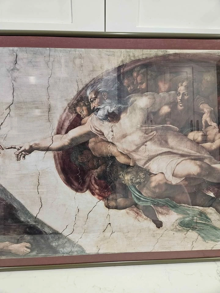 Large framed art print of Michelangelo’s The Creation of Adam, one of the most iconic works in art history.