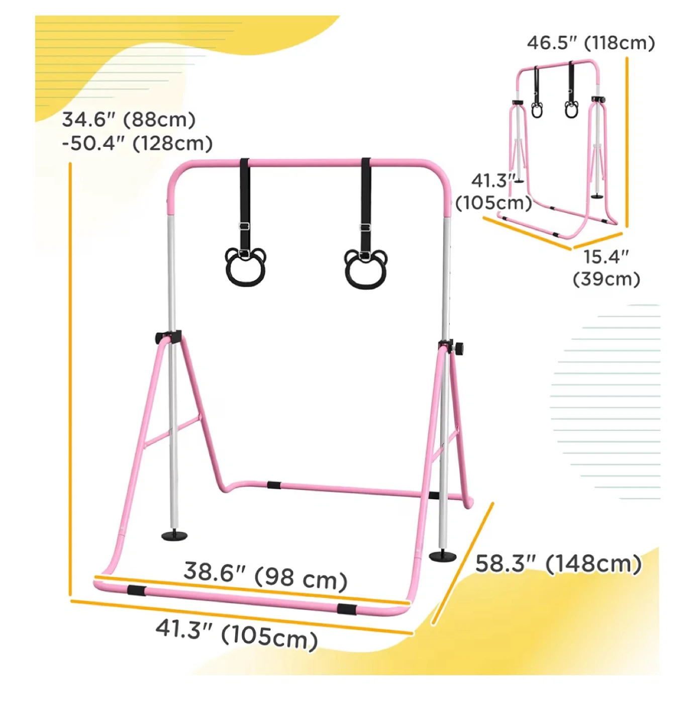 Selling a pink gymnastics bar with rings! It's in great condition and perfect for young gymnasts. The dimensions are approximately 41.3" (105cm) in height, 38.6" (98cm) in width, and 58.3" (148cm) in depth. Great for practicing at home!