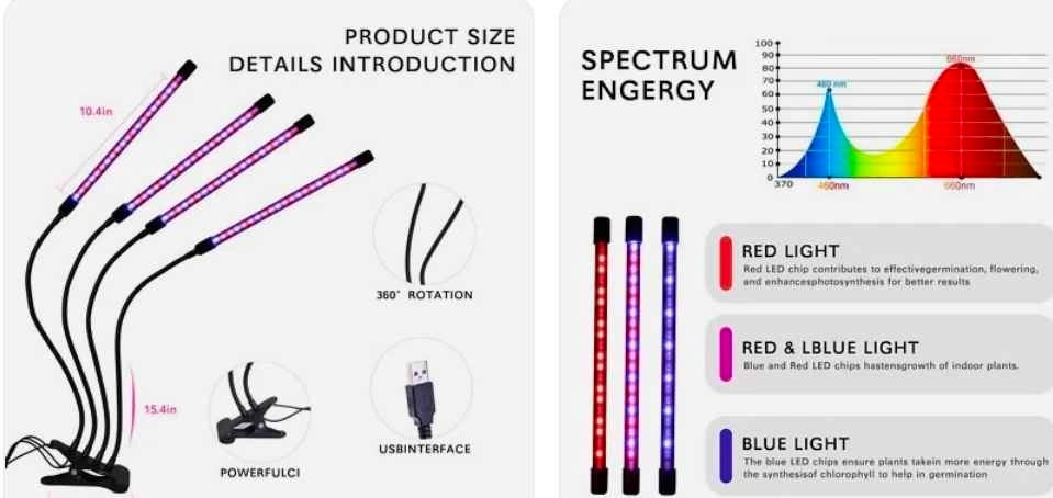 *USB LED Plant Grow Light *Color:Black *Plug type:USB Port *Input Voltage:DC 5V *Rated Current:2000 *Wattage:1 Heads:9W/2 Heads:18W/3 Heads:27W *Lifespan:More then 50000 hours *Cable Length:About 60cm *Switch type:Automatic memory switch *Material:Premium metal & Plastic,Made of durable and practical metal and plastic