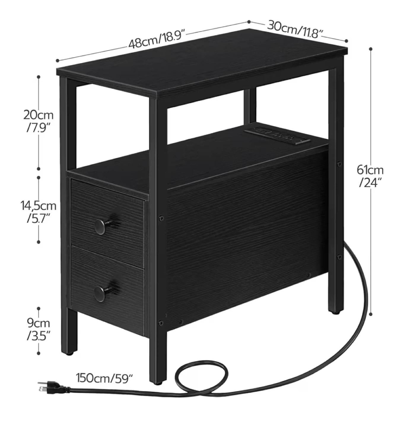 Looking to sell this handy black end table! It comes with a built-in charging station, perfect for keeping your devices powered up. It also has two drawers for extra storage. Dimensions are approximately 24" high, 18.9" wide, and 11.8" deep