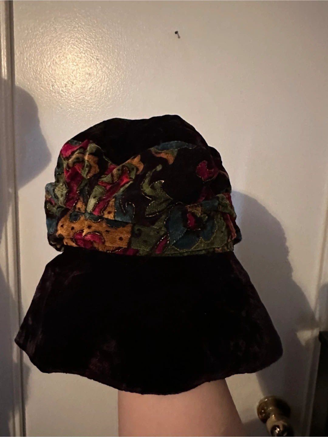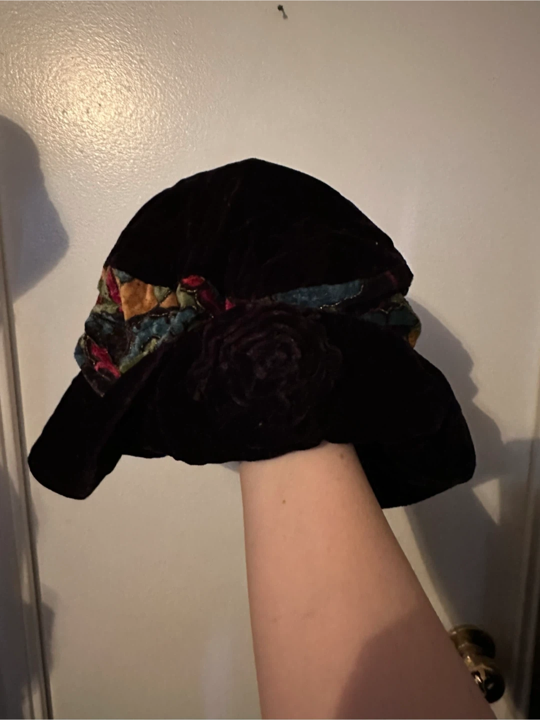 Vintage black hat with colourful band and a black rose in the front (hard to see on camera because of the colouring). I can send more pictures if needed!