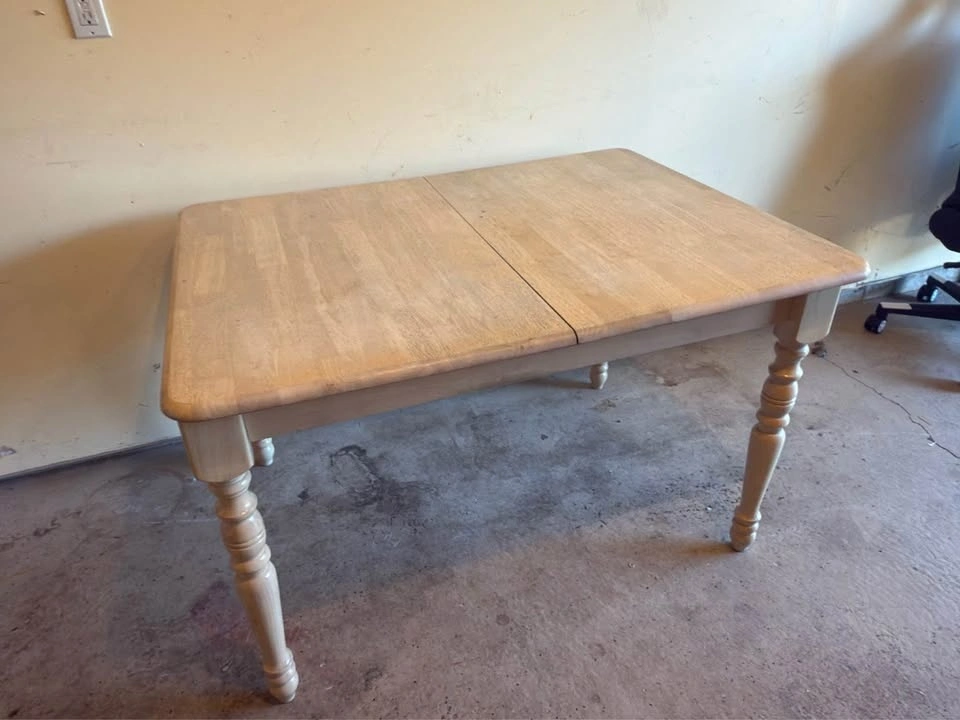 Beautiful solid wood dining table with an extendable leaf. Perfect for small spaces and easily expands when you need extra seating. Sturdy construction with classic turned legs. Great for a dining room, kitchen, or breakfast nook.