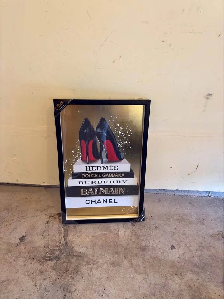 Elegant luxury fashion wall art featuring iconic designer brands (Hermès, Dolce & Gabbana, Burberry, Balmain, Chanel) with high-heel artwork. Perfect for a closet, boutique, salon, office, or modern home décor.