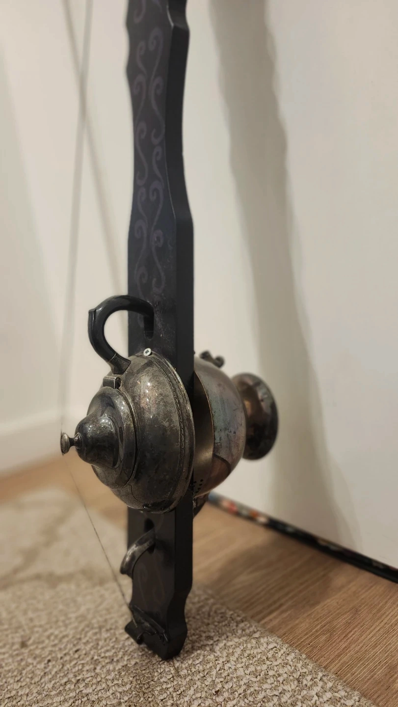This is a unique decorative wall hanging. It features a black wooden base with a silver-toned metal teapot-like structure attached. It's definitely a conversation starter and adds a touch of whimsy to any room.