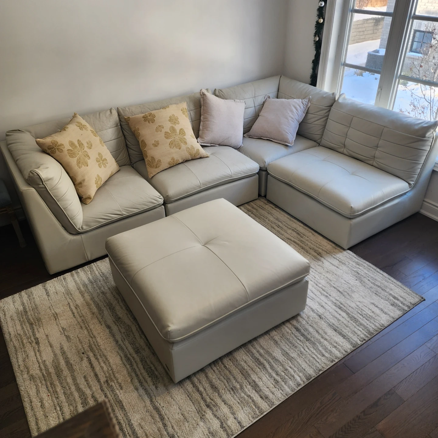 CARPET EXCEPT - Selling a comfortable modular sectional sofa (Leather) in a light grey colour! It’s in great condition and ready to add some coziness to your living space. Perfect for lounging and easy to rearrange to fit your needs