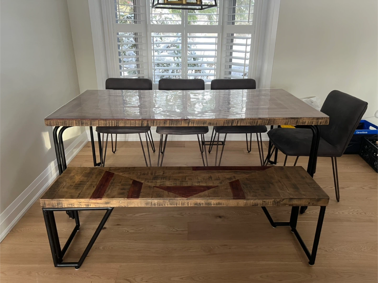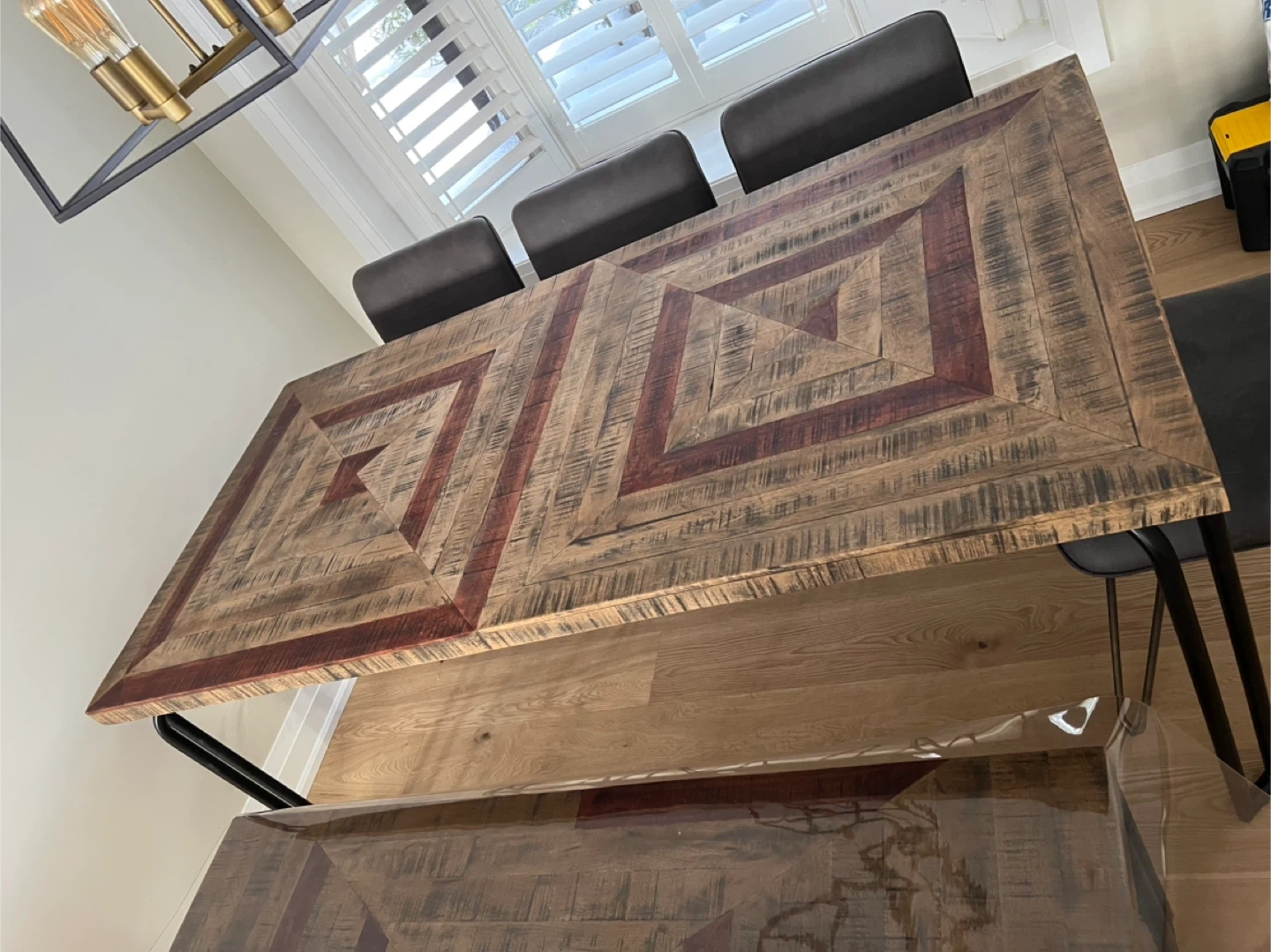 Selling a beautiful rustic wood dining table with a matching bench. The table has a unique geometric design and comes with a custom protective top. Very well maintained and in a like new condition.