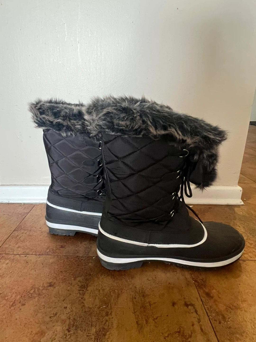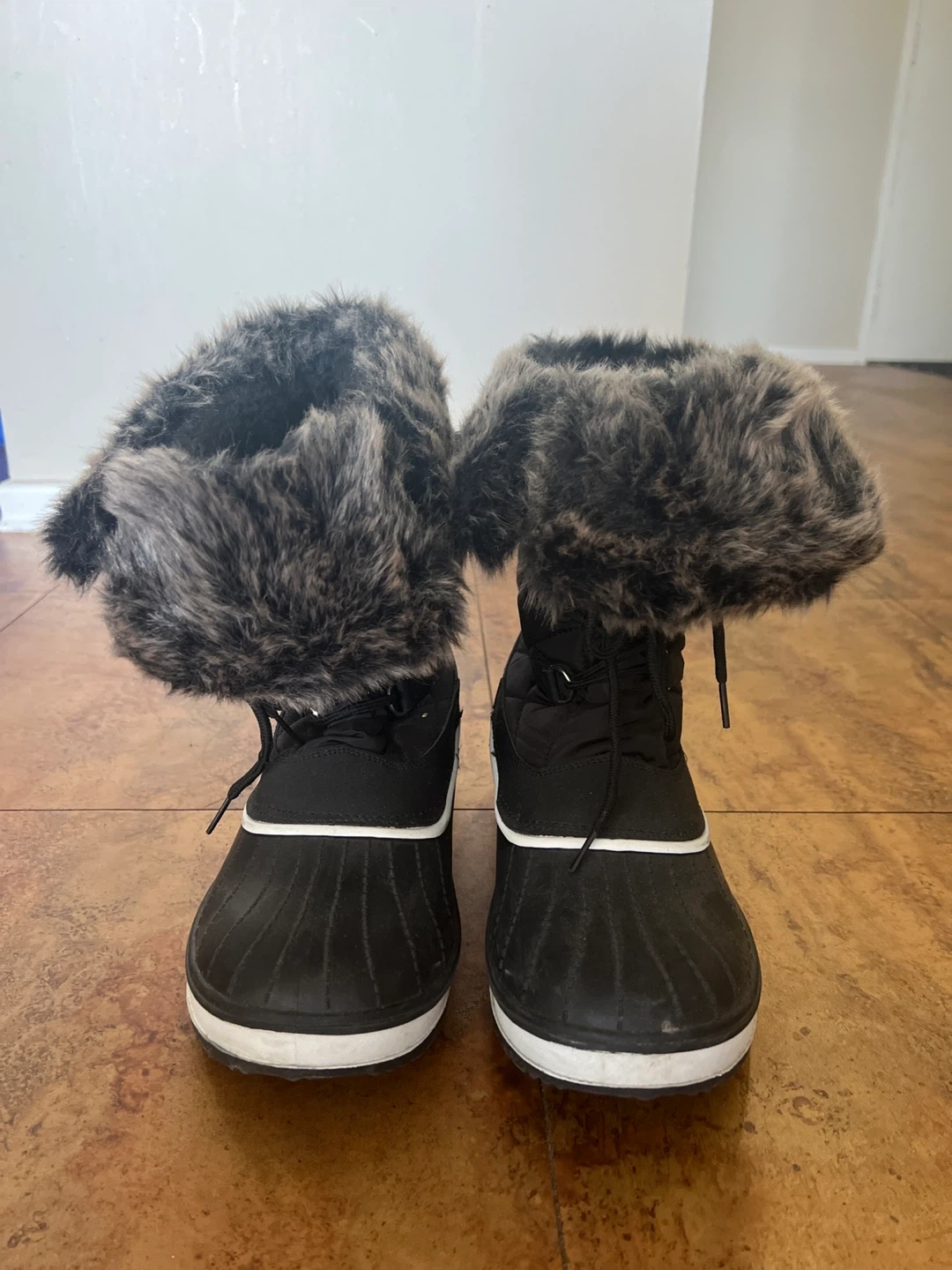 Cozy black winter boots with a faux fur trim around the top. Perfect for keeping your feet warm and dry during the colder months. They are in great condition and ready for some snowy adventures!