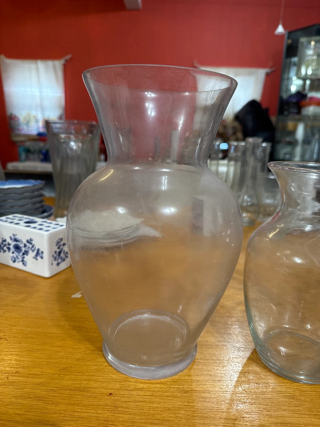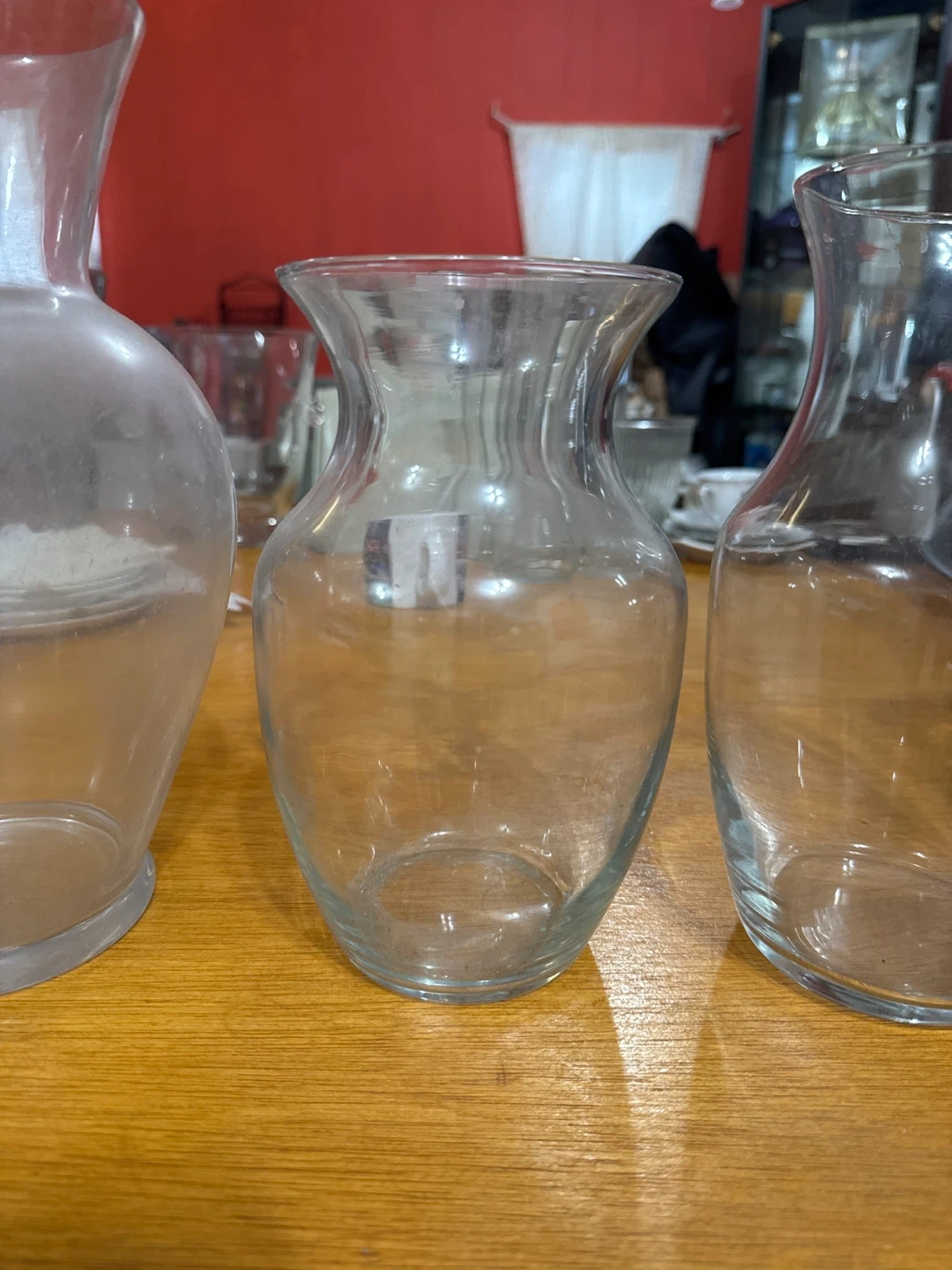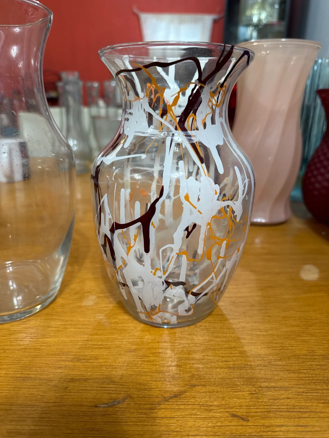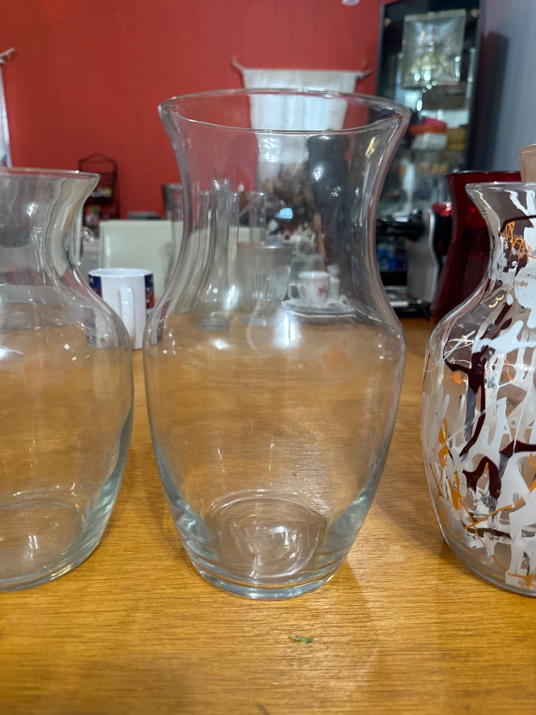 Selling a collection of clear glass vases! They're perfect for displaying flowers or adding a touch of elegance to your home decor. The vases come in various shapes and sizes, including one with a unique painted design