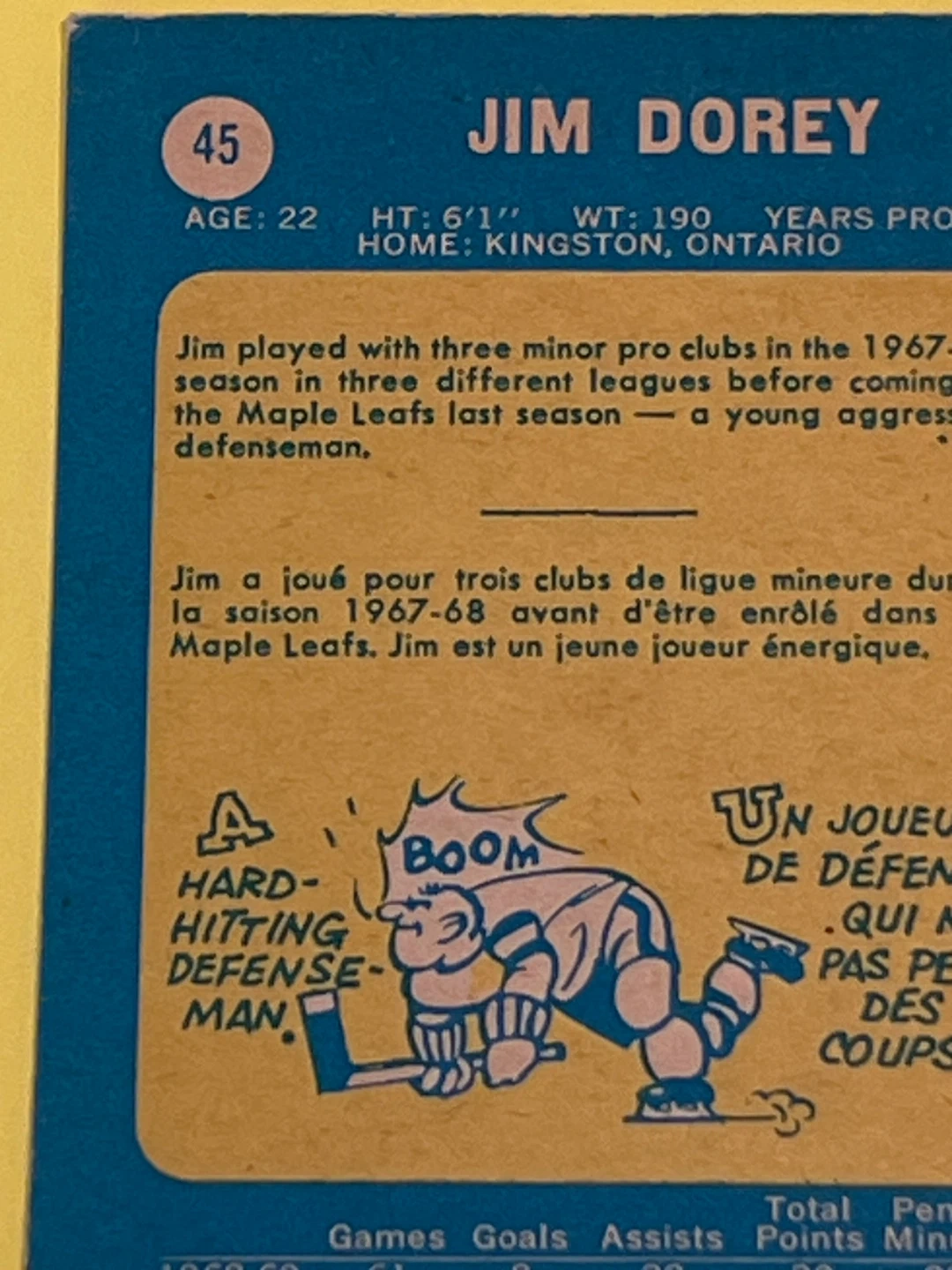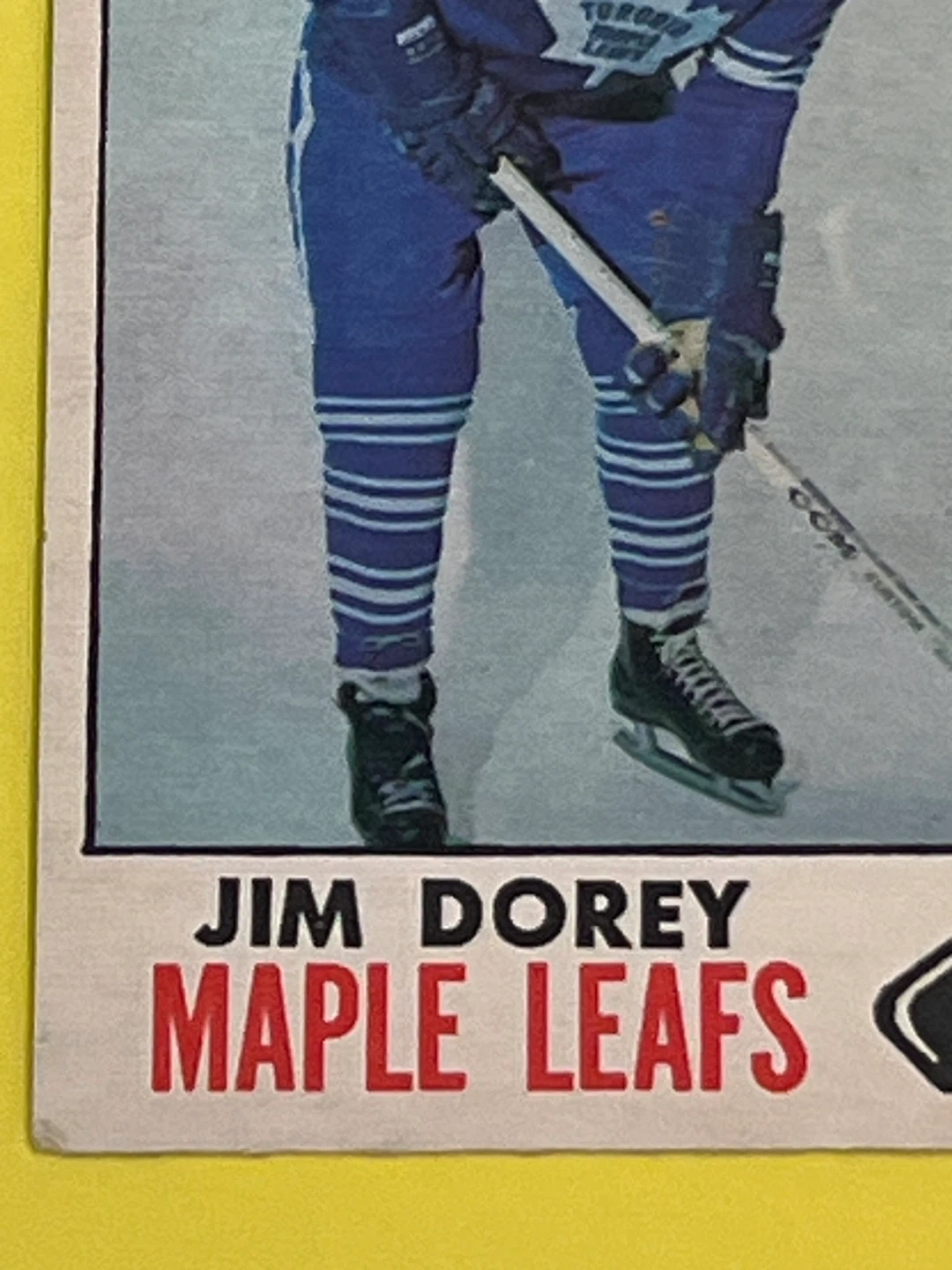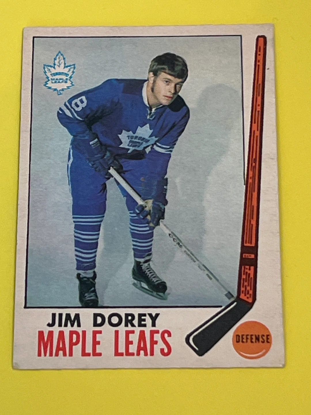 Selling a vintage Jim Dorey Maple Leafs hockey card. It's from when he played defence for the team. A cool piece of sports memorabilia!