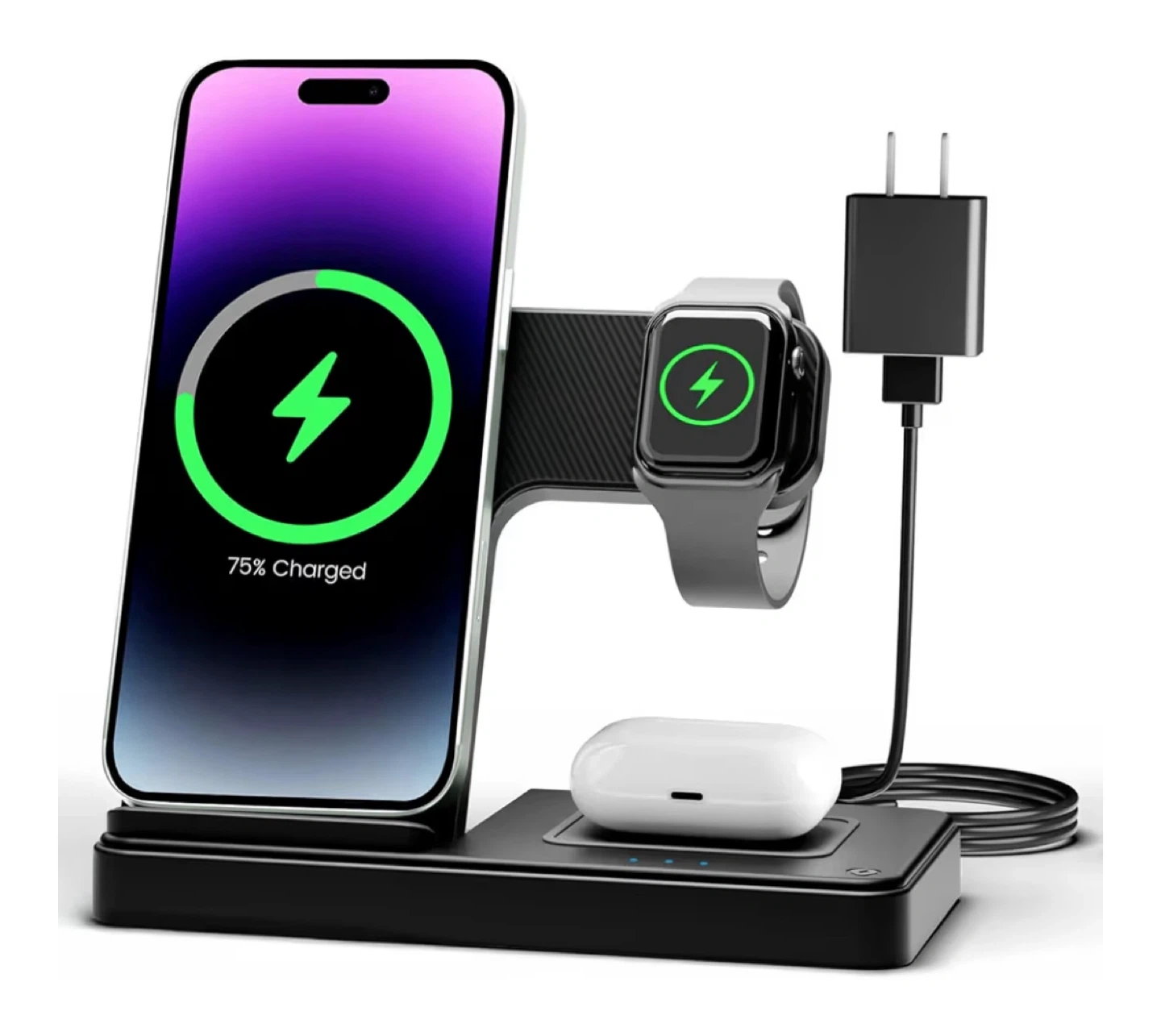 Selling a 3-in-1 wireless charger stand in black! It's perfect for charging your phone, Apple Watch, and AirPods all at once.