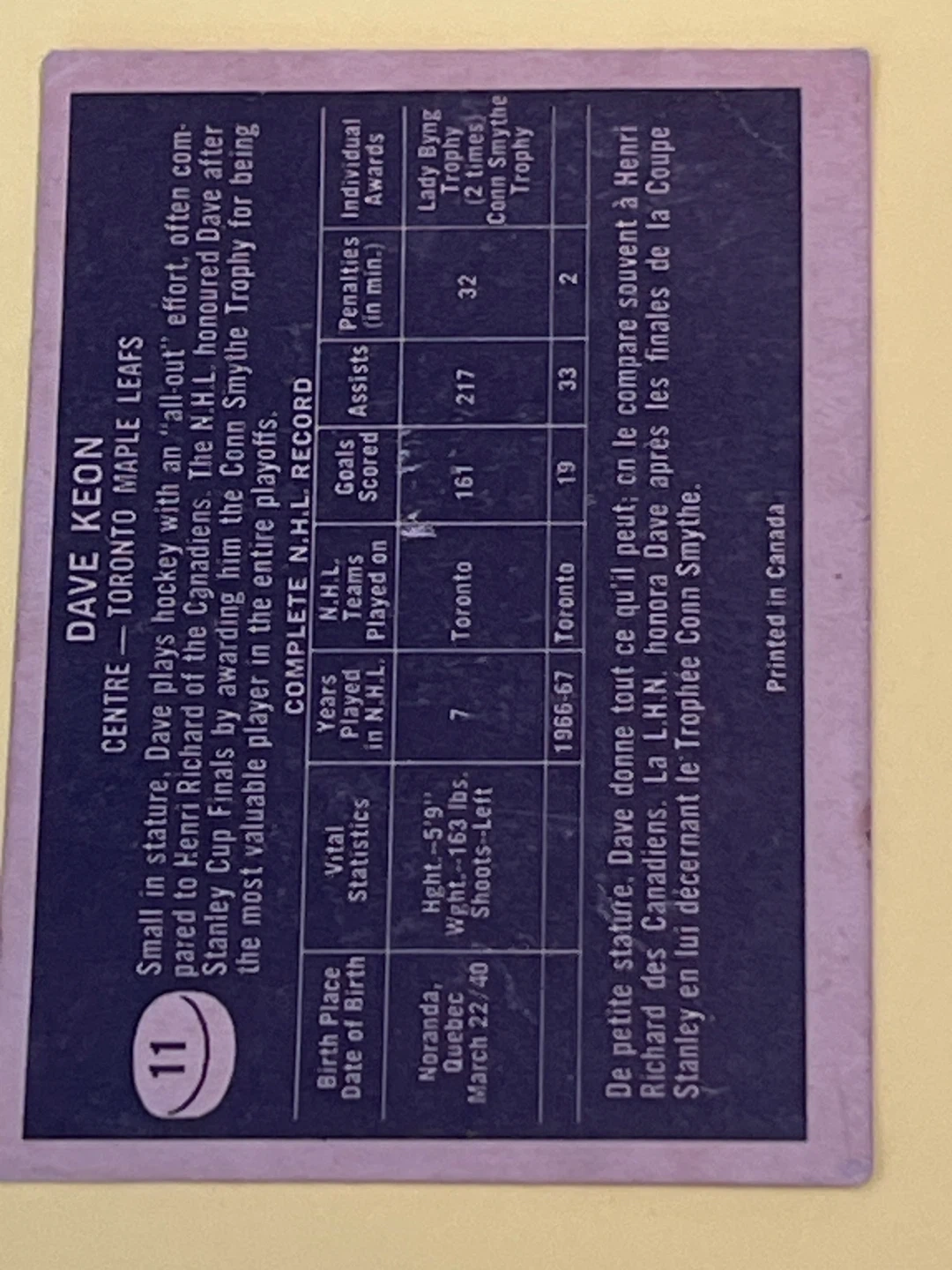DAVE KEON 1967 Topps #11, TORONTO MAPLE LEAFS, Hockey Card