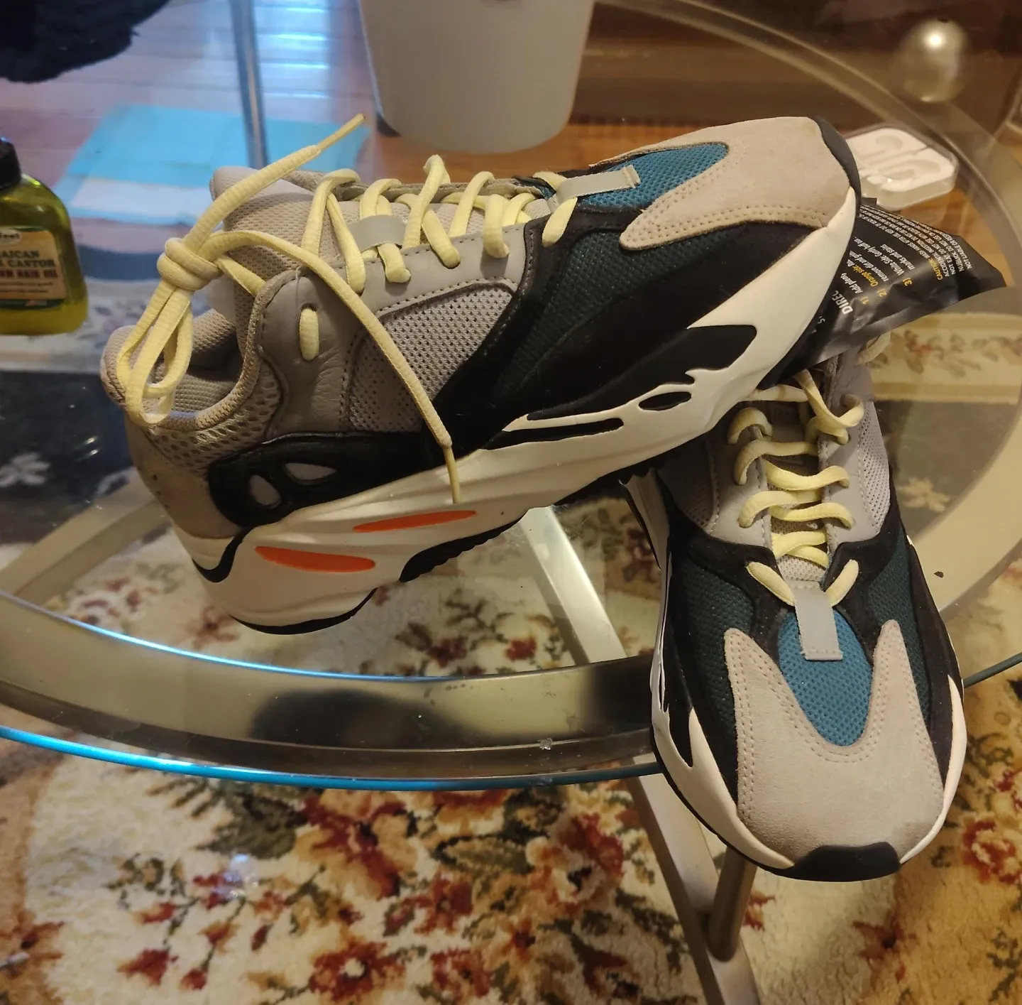 Selling a pair of Adidas Yeezy Boost 700 Wave Runner sneakers. These are a stylish and comfortable option for everyday wear. The shoes feature a blend of grey, black, and teal colors with orange accents on the midsole. They are in good condition and ready for a new owner! Make me your best Offer.