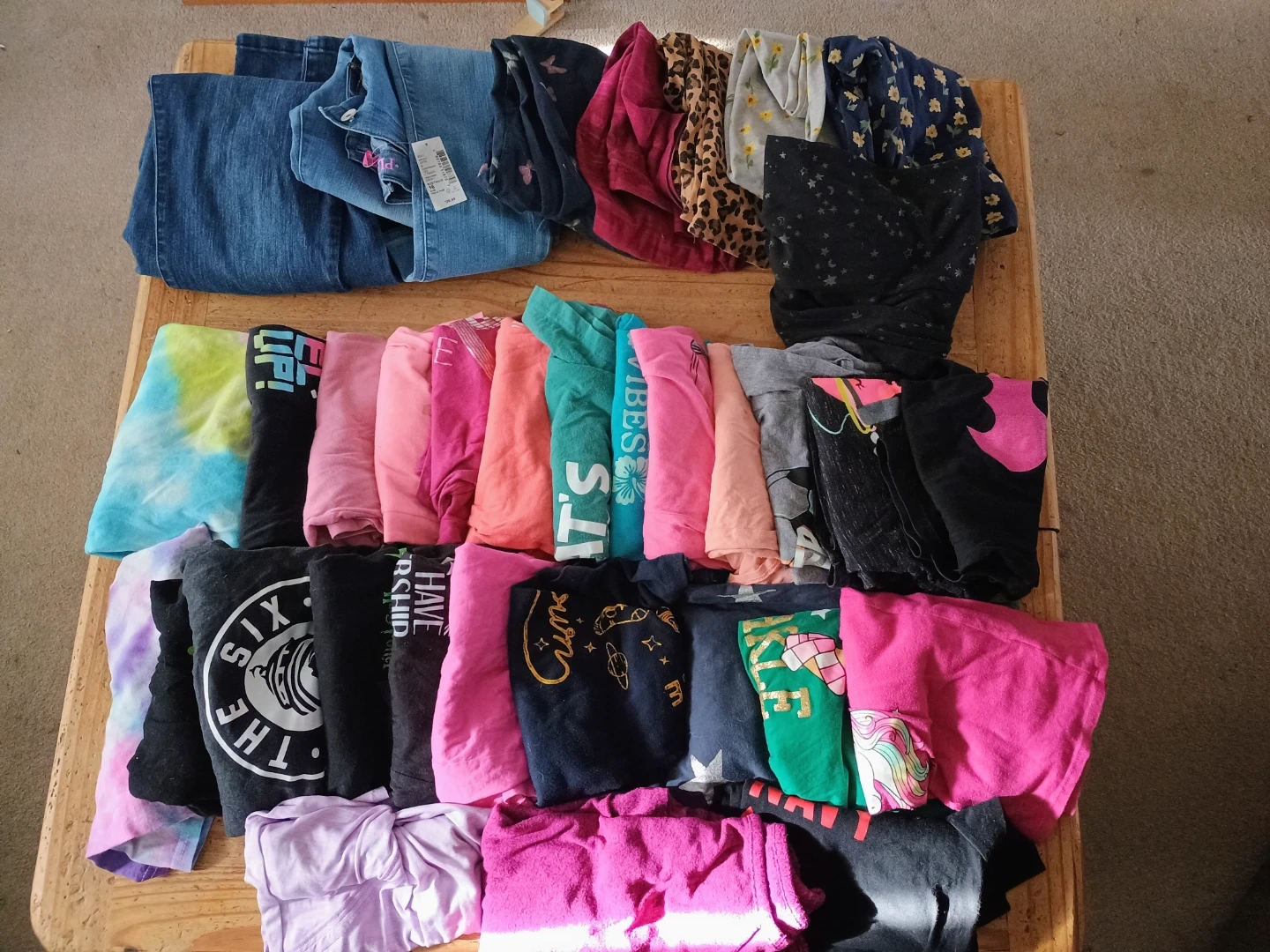 Selling a bundle of girls' clothing in various sizes and styles! There's a mix of jeans, tops, and other items. Perfect for stocking up on some new outfits!