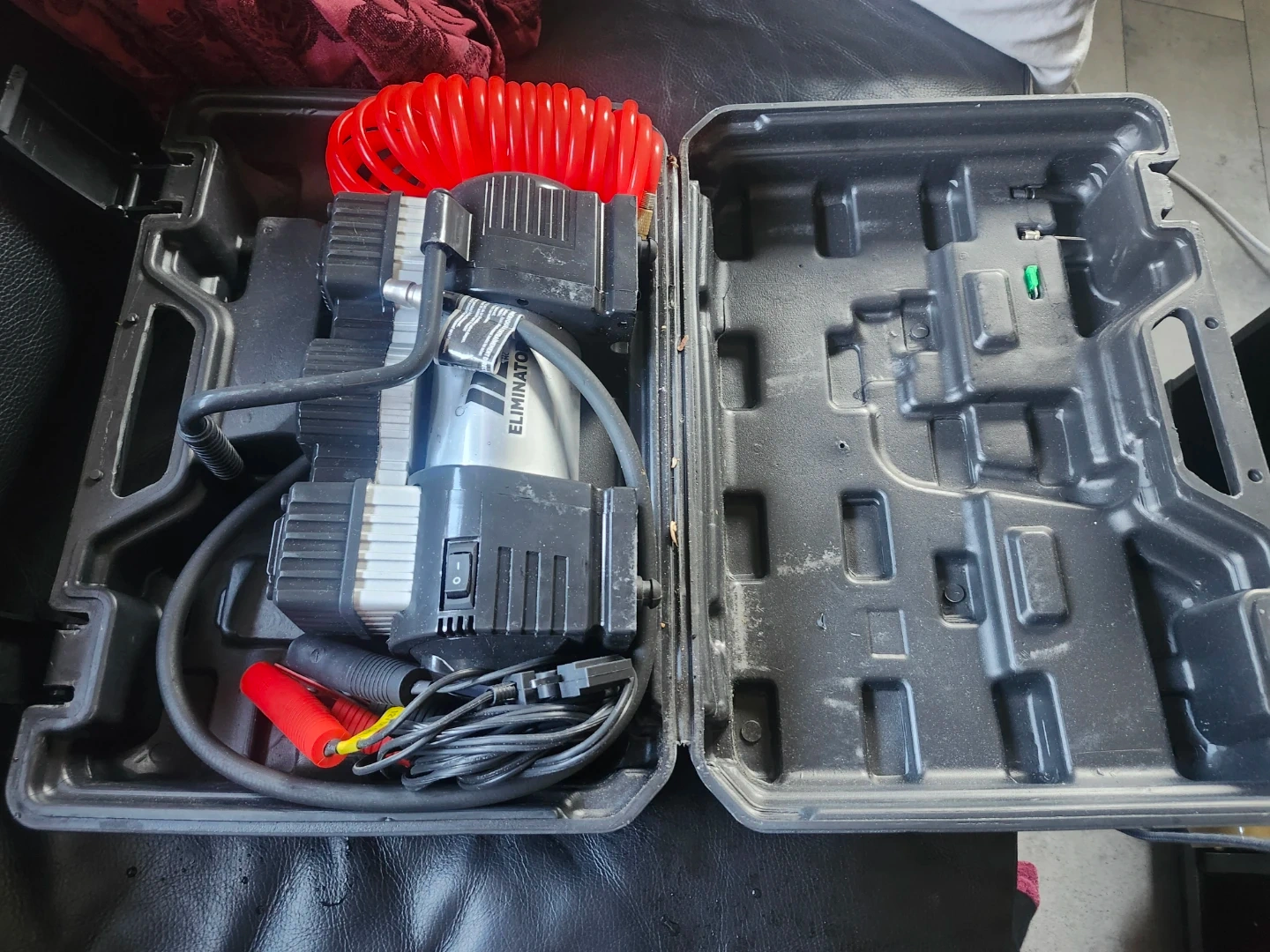 Selling a portable Eliminator air compressor. It comes in its original case and includes all the components you see in the photos. Great for inflating tires or other inflatables on the go
