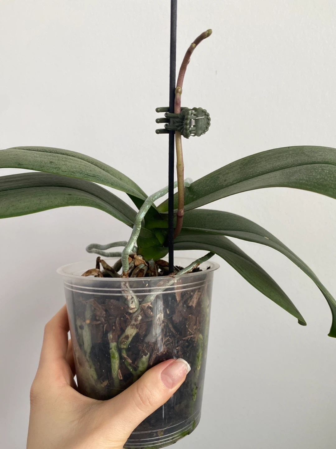 Selling a potted orchid! It's currently in a clear plastic pot, and it includes a support stake to help it grow nice and tall