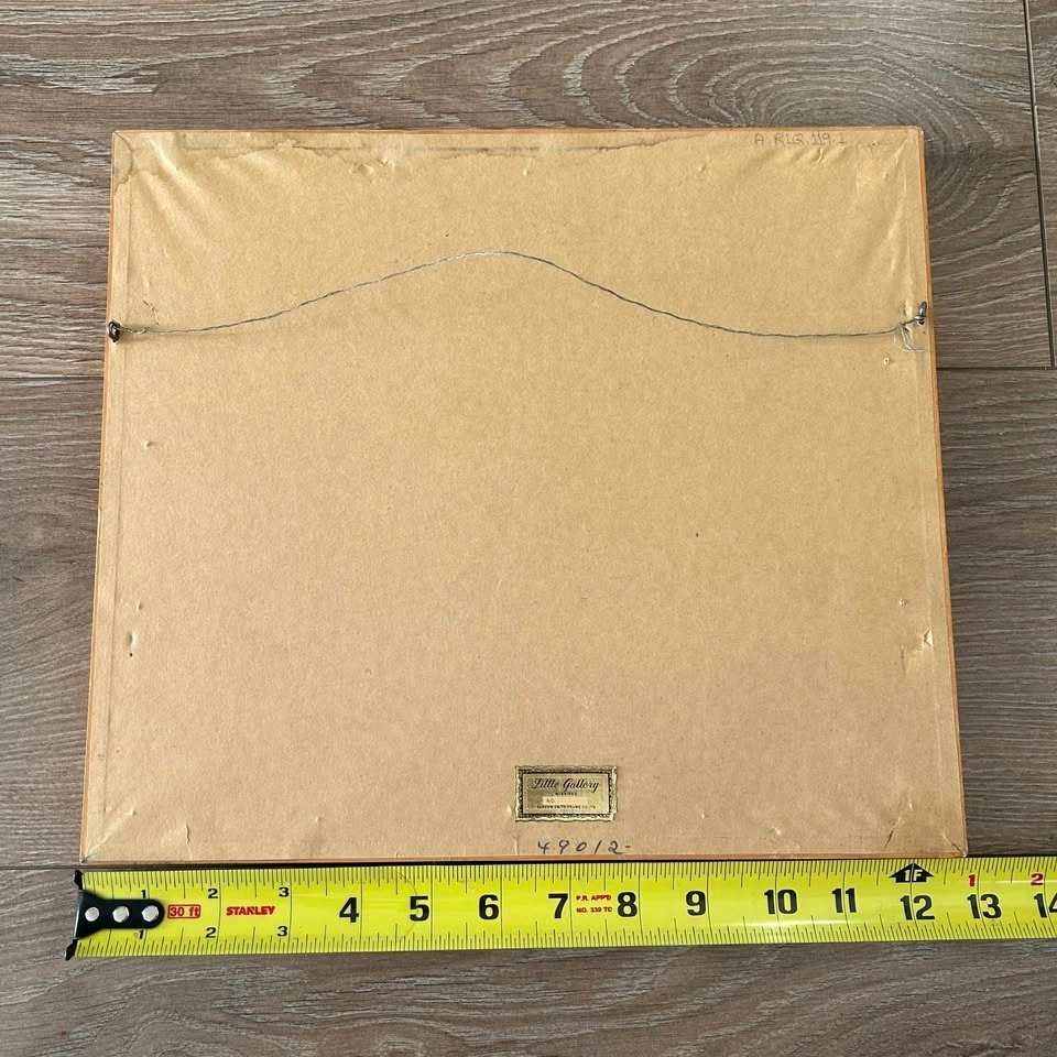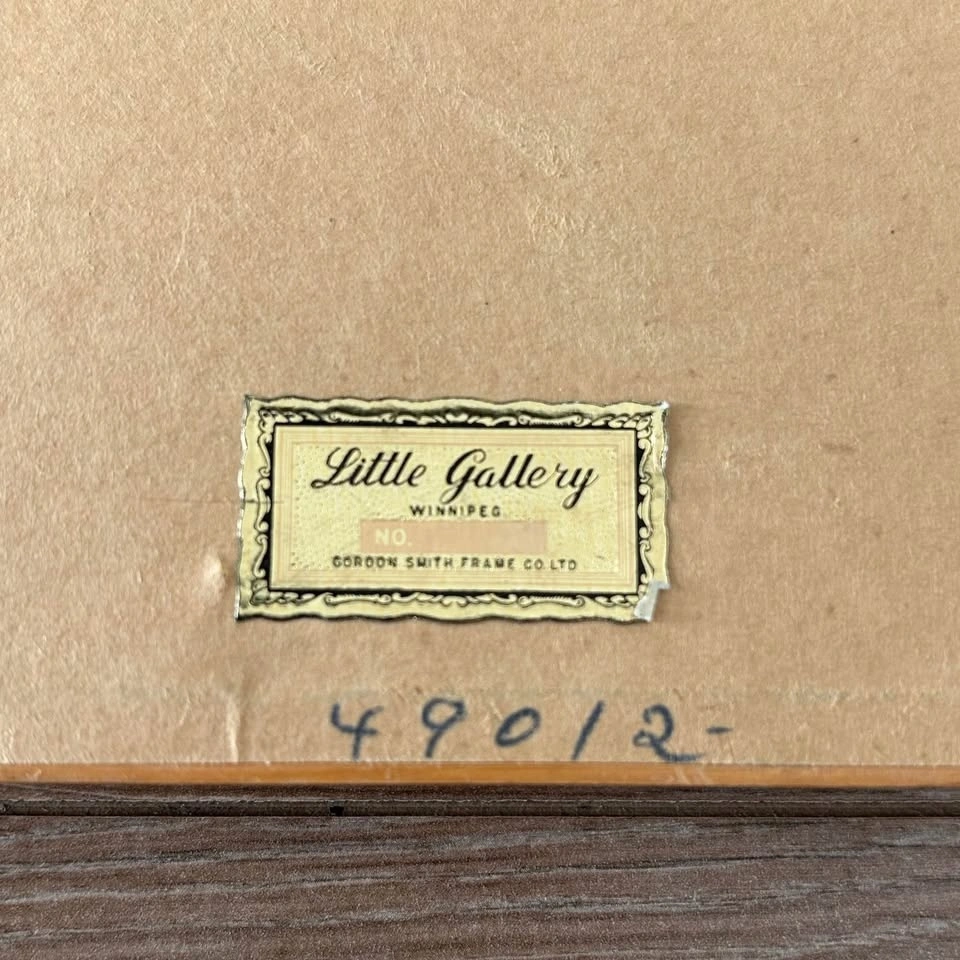 Framed in a vintage mid-century style frame, with a Little Gallery (Winnipeg) label on the back, adding provenance and collectible appeal.