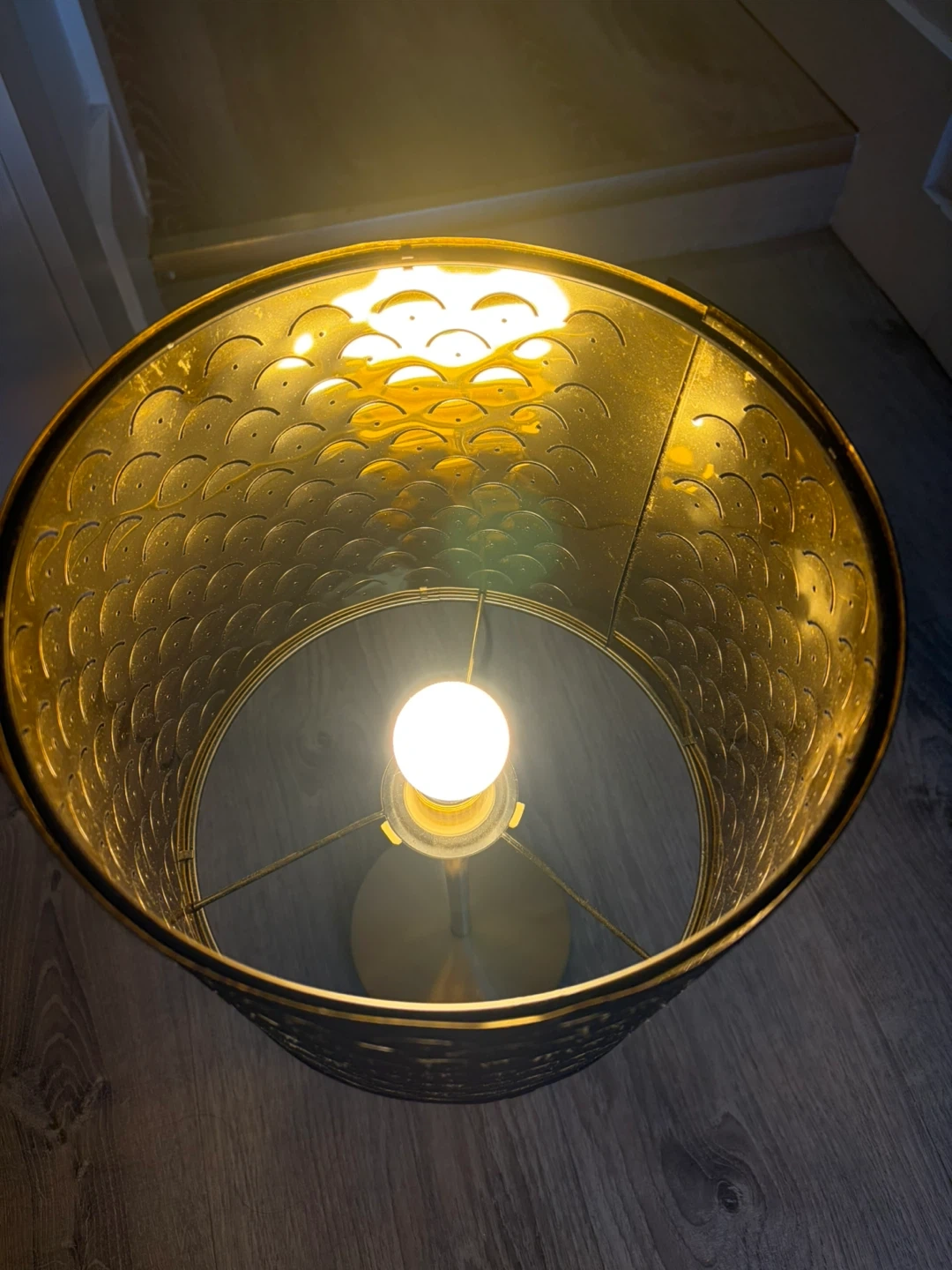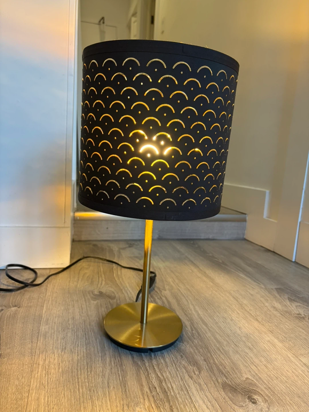 Selling a lovely IKEA Skaftet table lamp! It features a black lampshade with a gold pattern and a gold base. This lamp would be a great addition to any room needing a bit of extra light and style. It's in great condition and ready for a new home