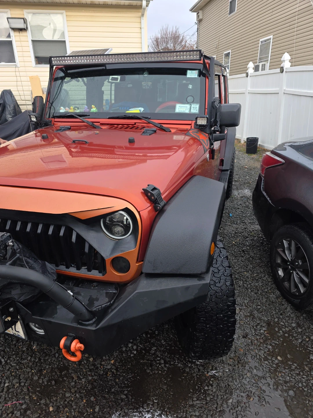 Selling a Jeep Wrangler with several modifications. It's orange and black. It has an aftermarket front bumper, light bar, and American flag window decals. The interior features a red steering wheel and a custom dashboard screen sale or trade