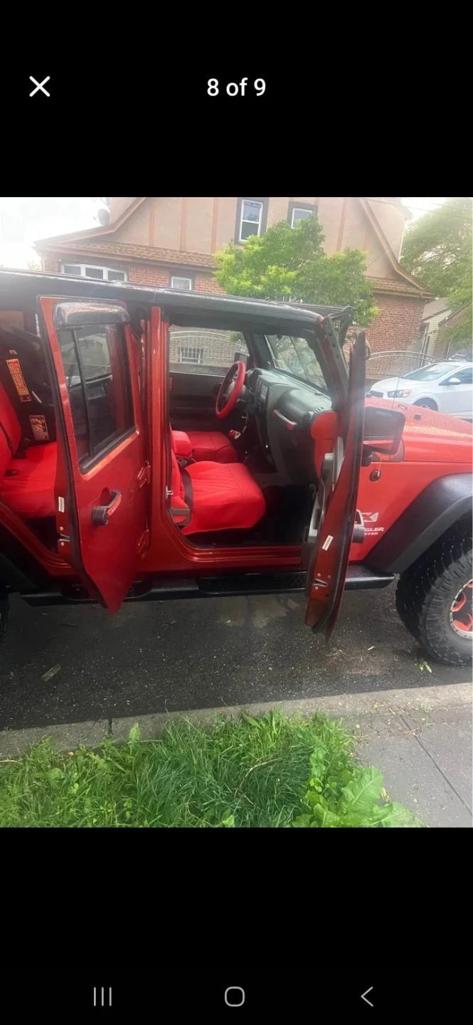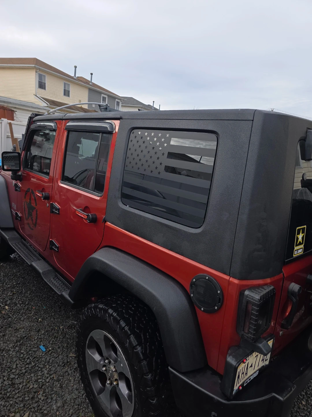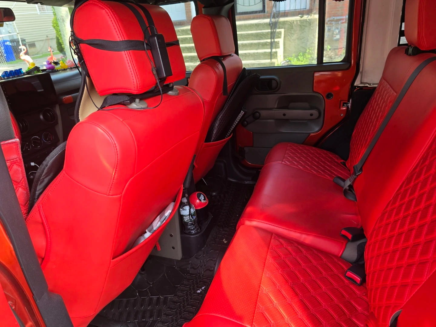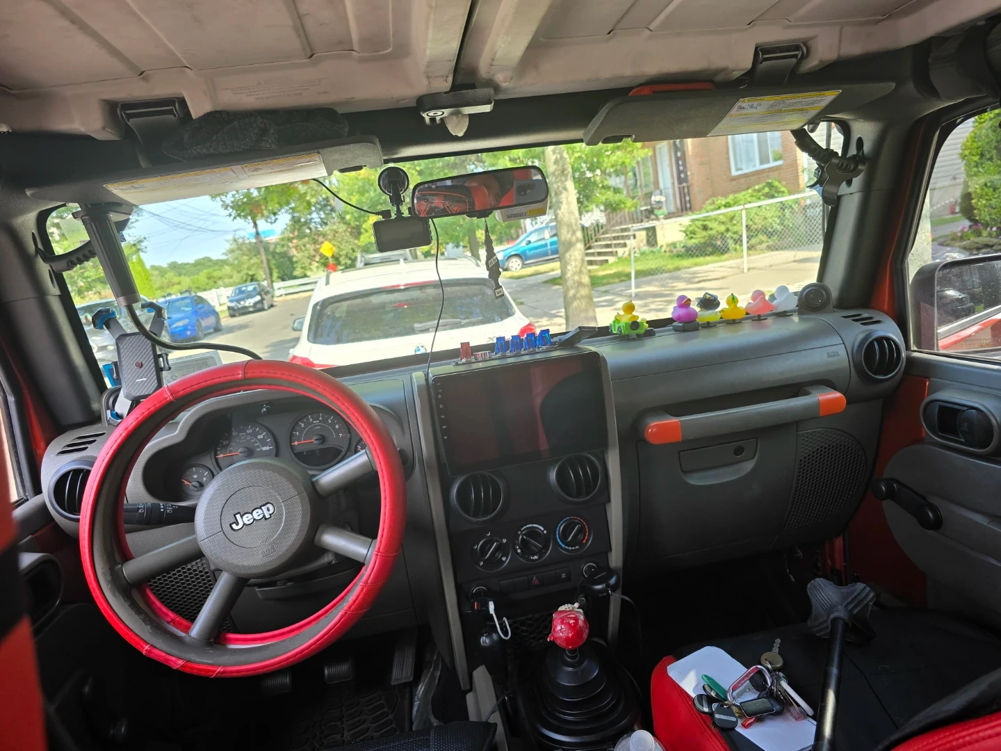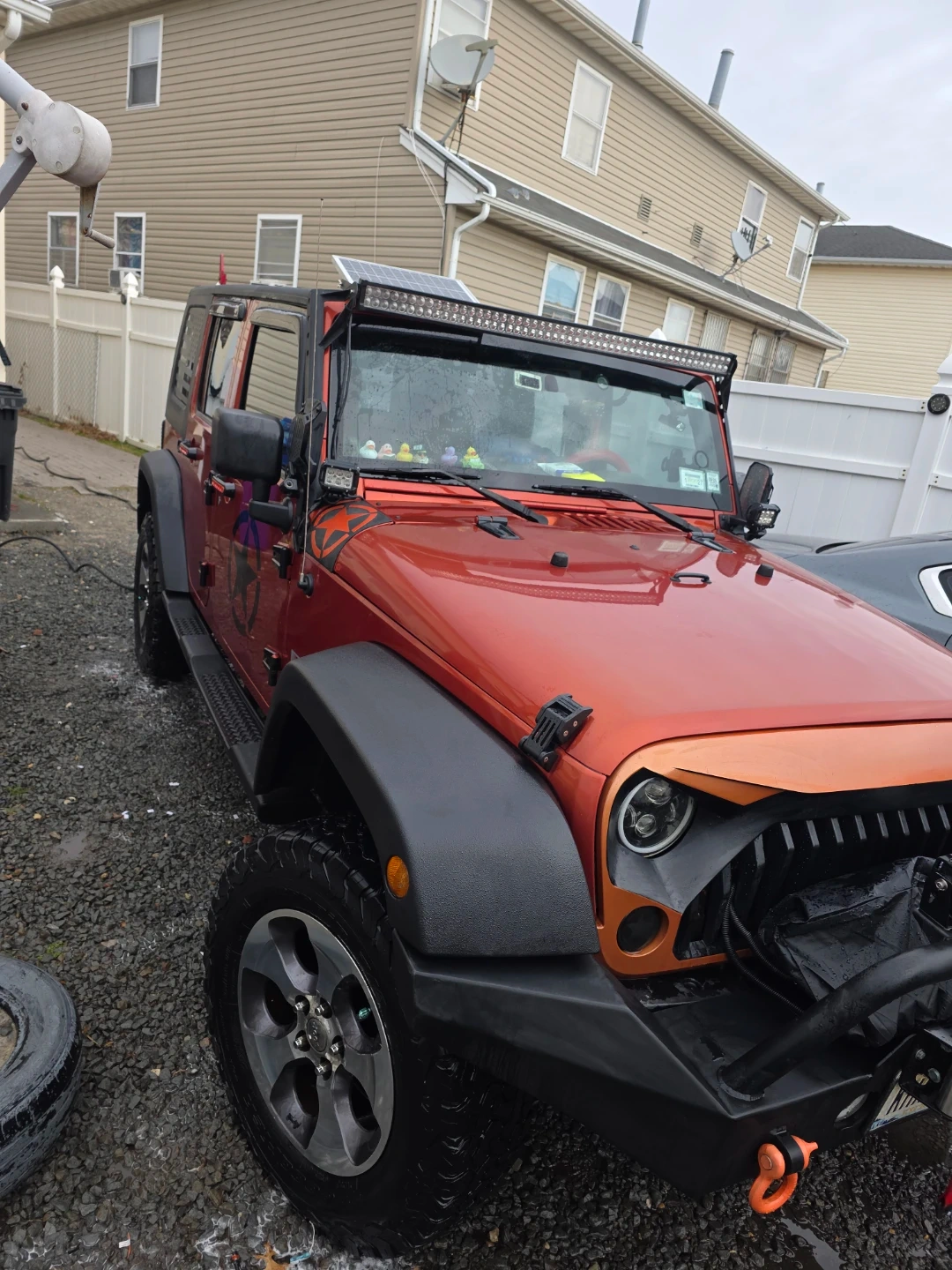 Selling a Jeep Wrangler with several modifications. It's orange and black. It has an aftermarket front bumper, light bar, and American flag window decals. The interior features a red steering wheel and a custom dashboard screen sale or trade
