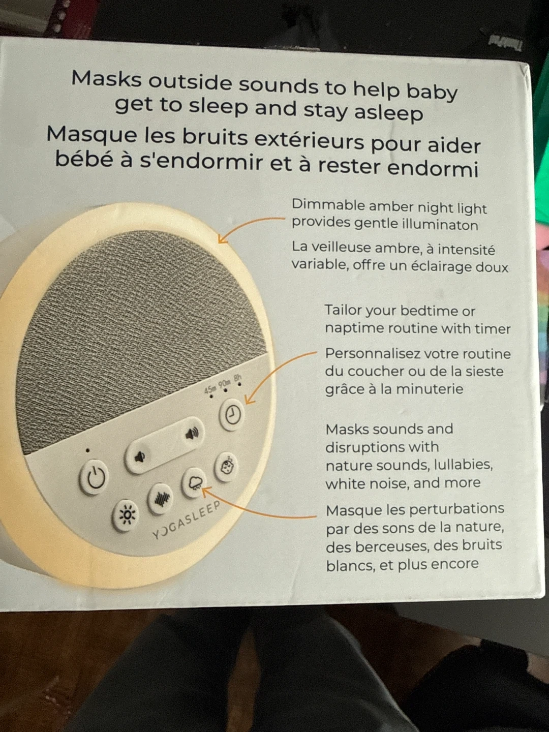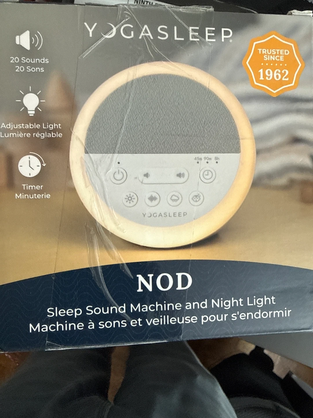 Selling a Yogasleep Nod sleep sound machine and night light. It masks outside sounds to help baby get to sleep and stay asleep. It also masks sounds and disruptions with nature sounds, lullabies, white noise, and more. Features include: