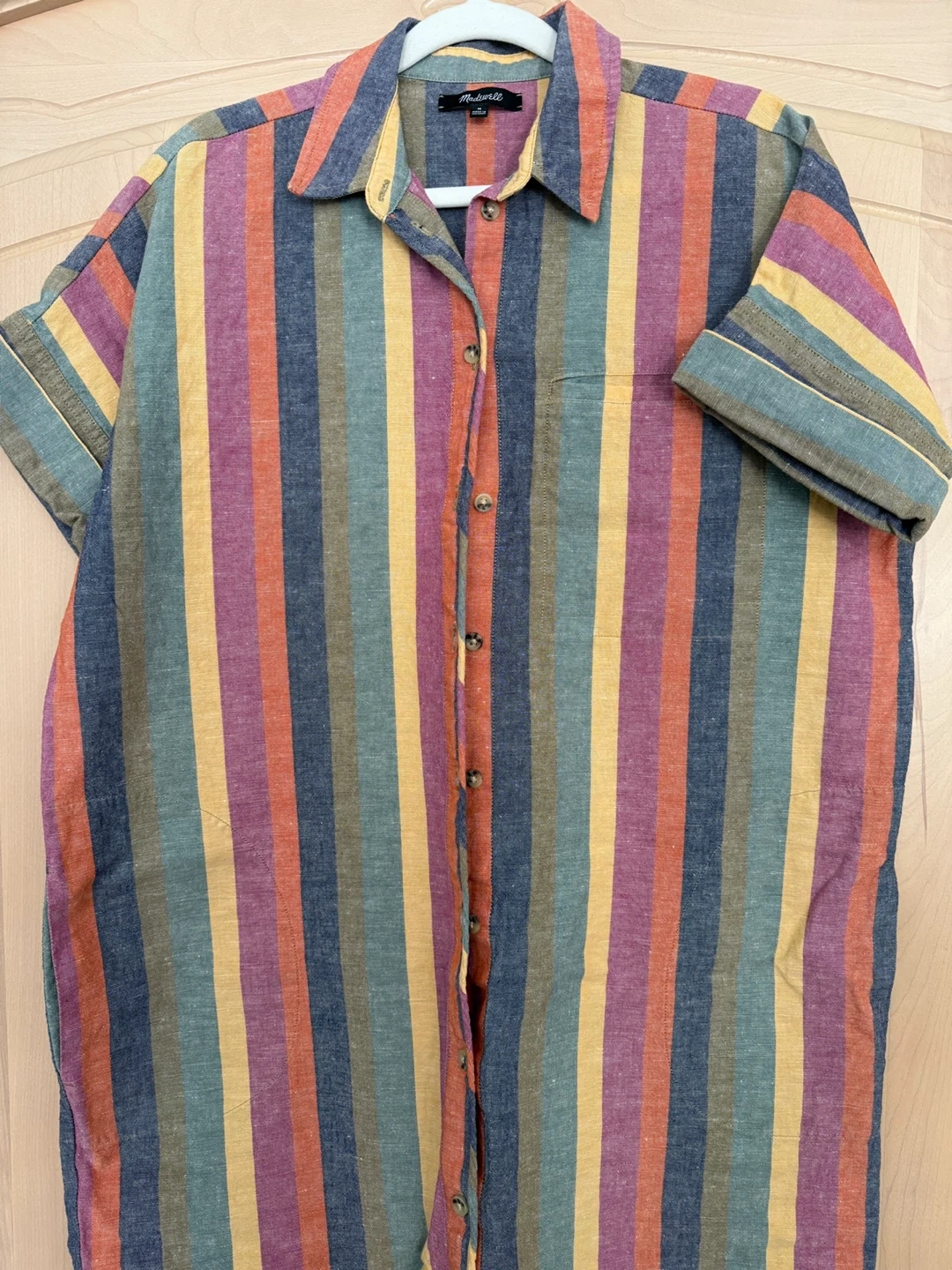 Here's a fun and colourful striped short sleeve shirt from Madewell! It's in great condition and ready for a new wardrobe. The stripes feature a mix of colours, making it easy to pair with different outfits