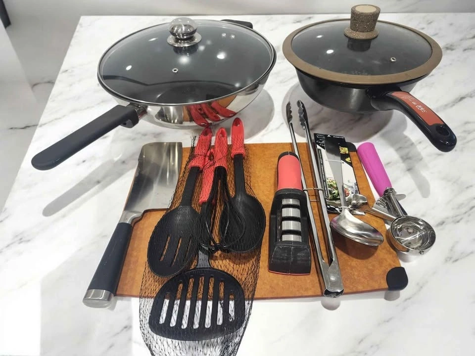 14 kitchenware, set of woke , pots, pans & assorted cooking uten