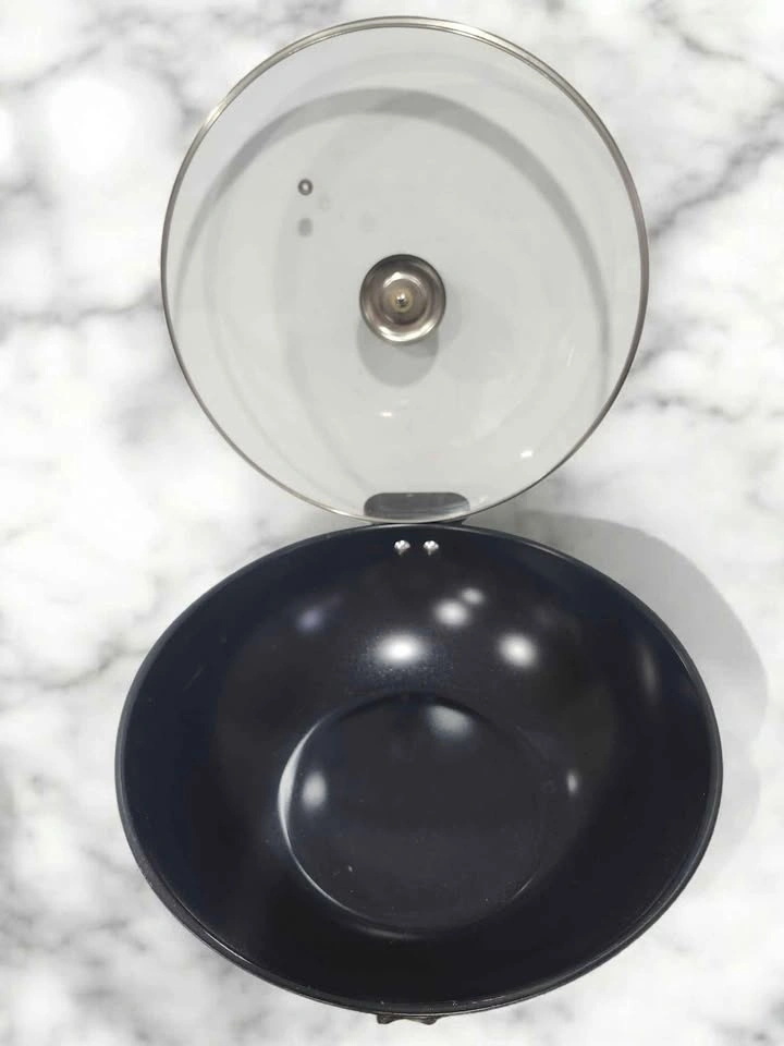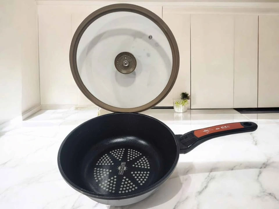 Two frying pans, one larger stainless steel or metallic, and a smaller non-stick with a brown/bronze exterior. Both pans come with clear, vented glass lids.