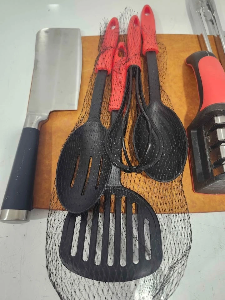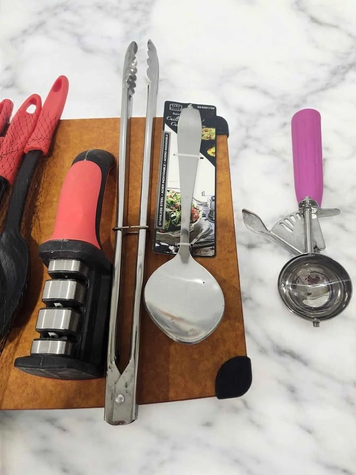 Also included are a chef's knife, stainless steel tongs, black nylon or silicone slotted spoons and a slotted turner (spatula), a metal ice cream scoop with a pink handle, and a small cutting board.