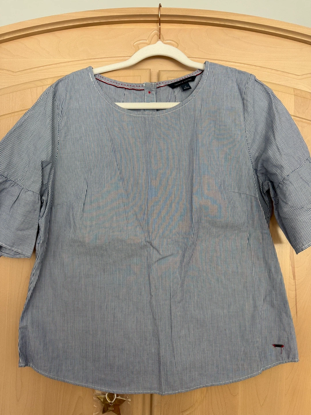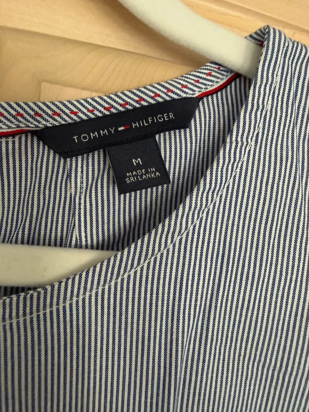 Here's a cute Tommy Hilfiger blouse in a blue and white striped pattern! It's a size M and features a stylish design. Perfect for a casual or dressed-up look!