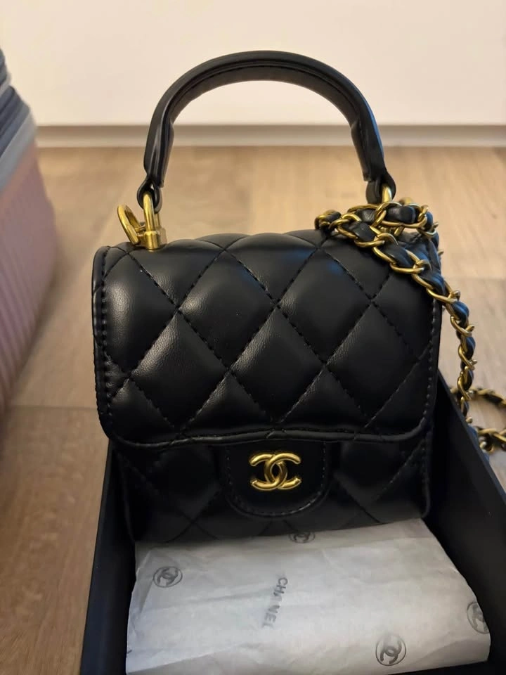 Mini beauty bag in black quilted leather with gold-tone hardware. This item was received as a gift with a beauty purchase.