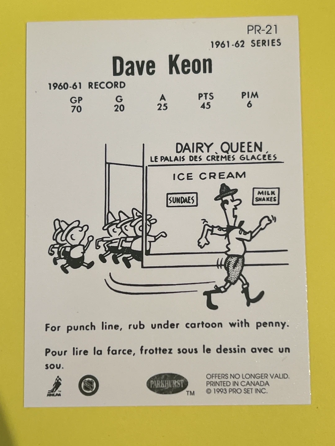 Selling a Dave Keon hockey card from the 1961-62 series. This card is from Parkhurst and was printed in Canada in 1993 by PRO SET INC. A fun piece of hockey history!