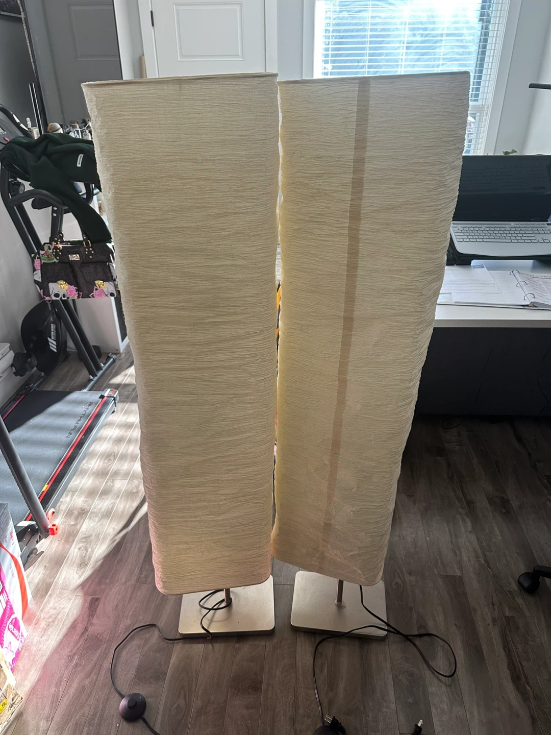 Selling a pair of IKEA floor lamps! They have a unique, textured shade and a sleek design that would look great in any living room or bedroom. They provide a nice, ambient light. Perfect for adding a touch of elegance to your space