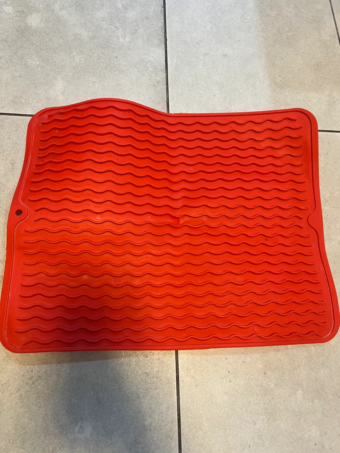 Selling a red silicone dish drying mat. It's great for protecting your countertops while your dishes dry! It's in great condition and ready to use