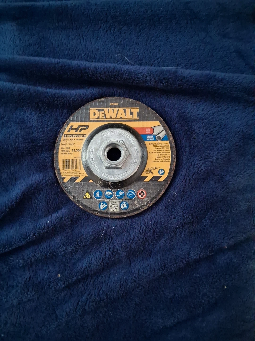 Selling a DEWALT DW4523 HP cut off wheel, sized at 4 1/2" x 1/4" x 5/8"-11 (115 x 6,4 x 16mm). It requires a safety guard and is designed for a maximum RPM of 13,300. Made in Thailand