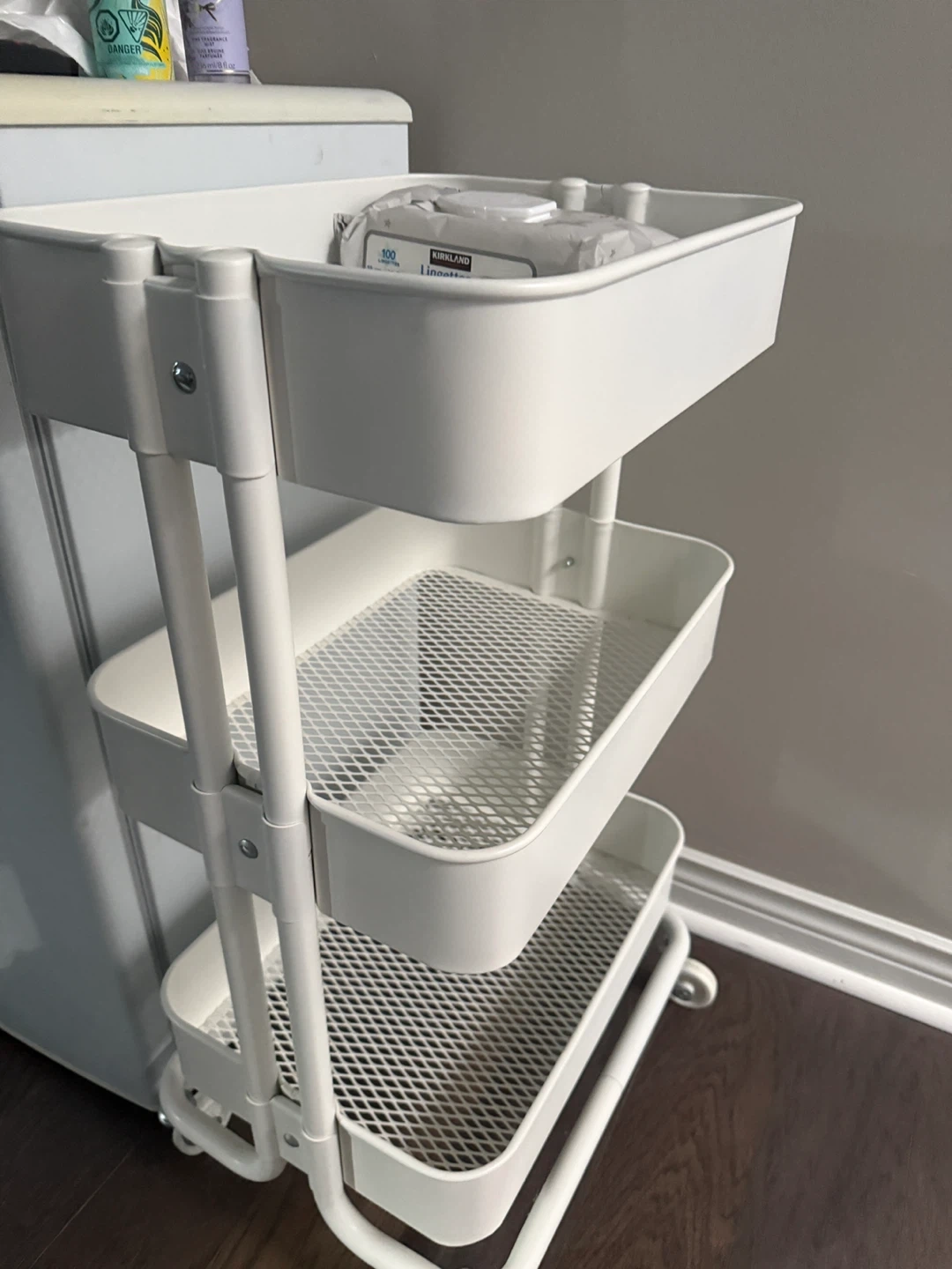 Selling a white IKEA Råskog utility cart. This handy cart is perfect for adding extra storage to any room in your home. Great for kitchens, bathrooms, or even as a bedside table on wheels