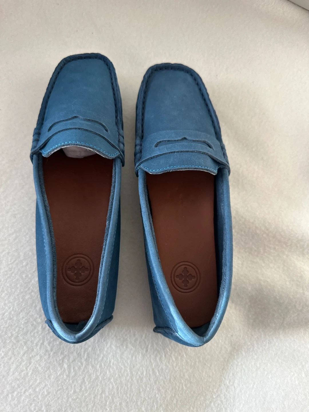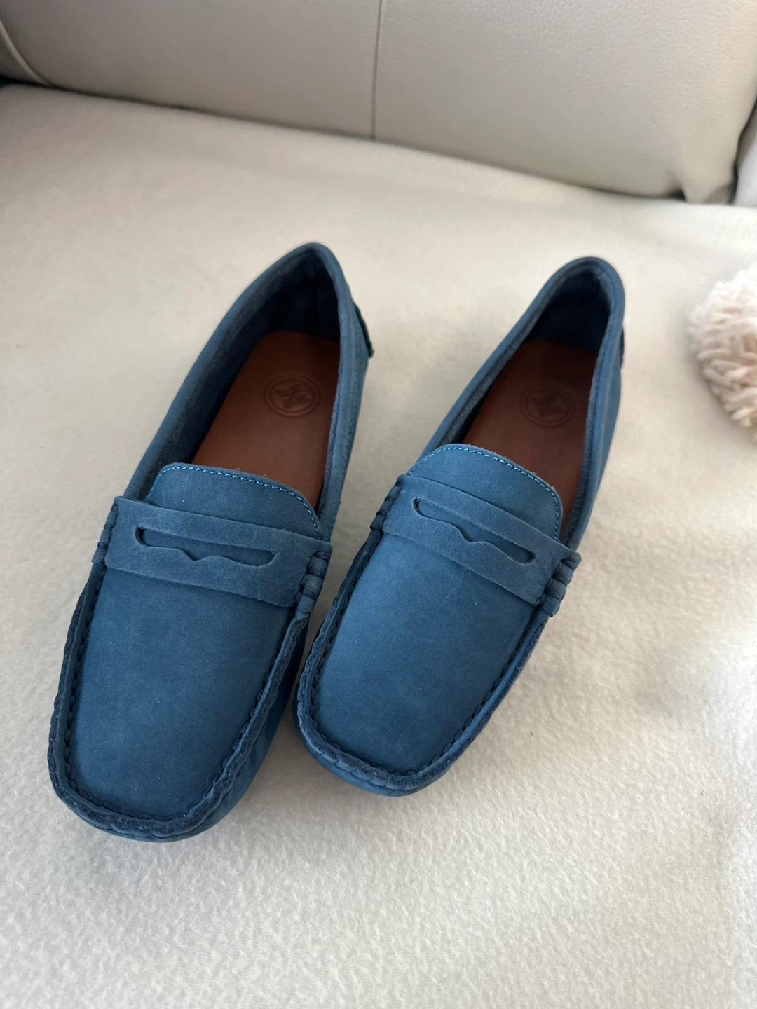 These are a pair of new loafers in a beautiful blue suede. They have a comfortable design with a stylish look. Perfect for casual or semi-formal wear!