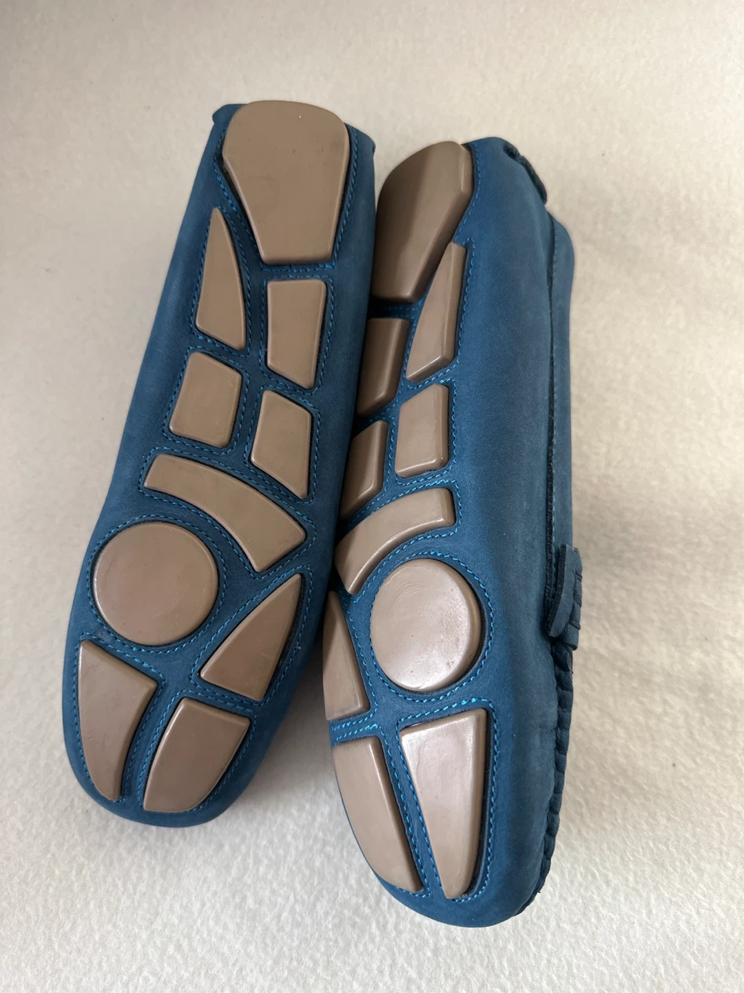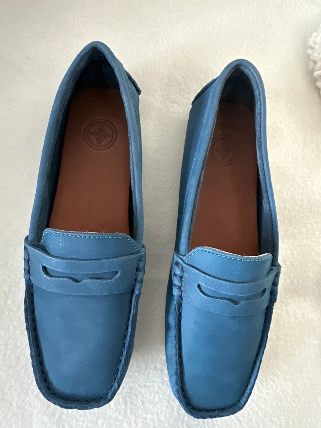 These are a pair of new loafers in a beautiful blue suede. They have a comfortable design with a stylish look. Perfect for casual or semi-formal wear!