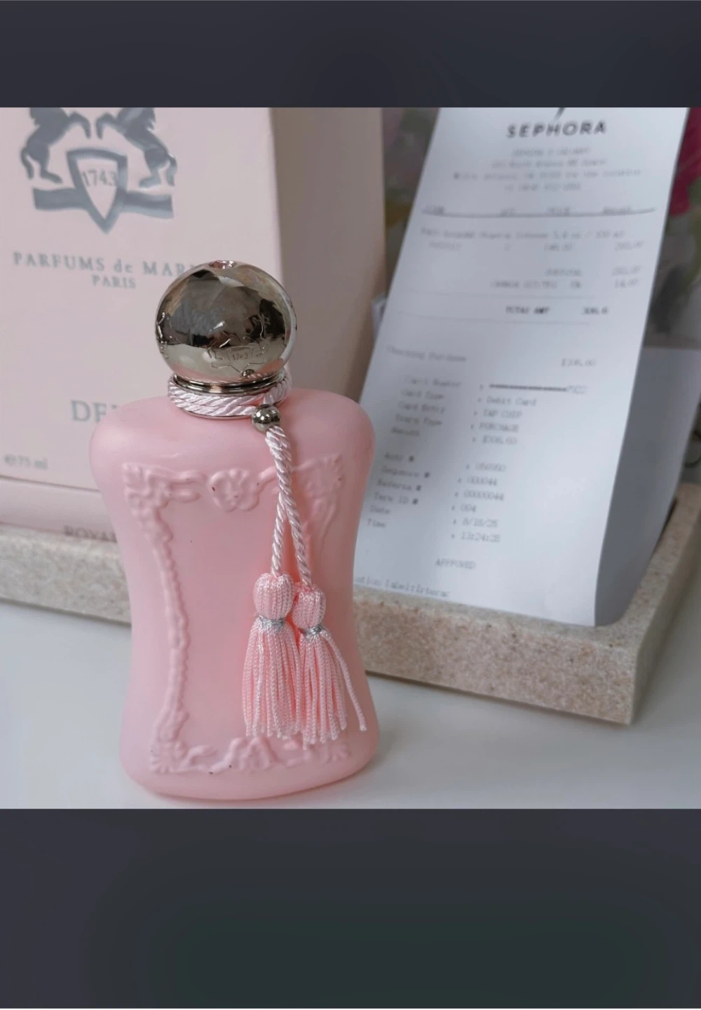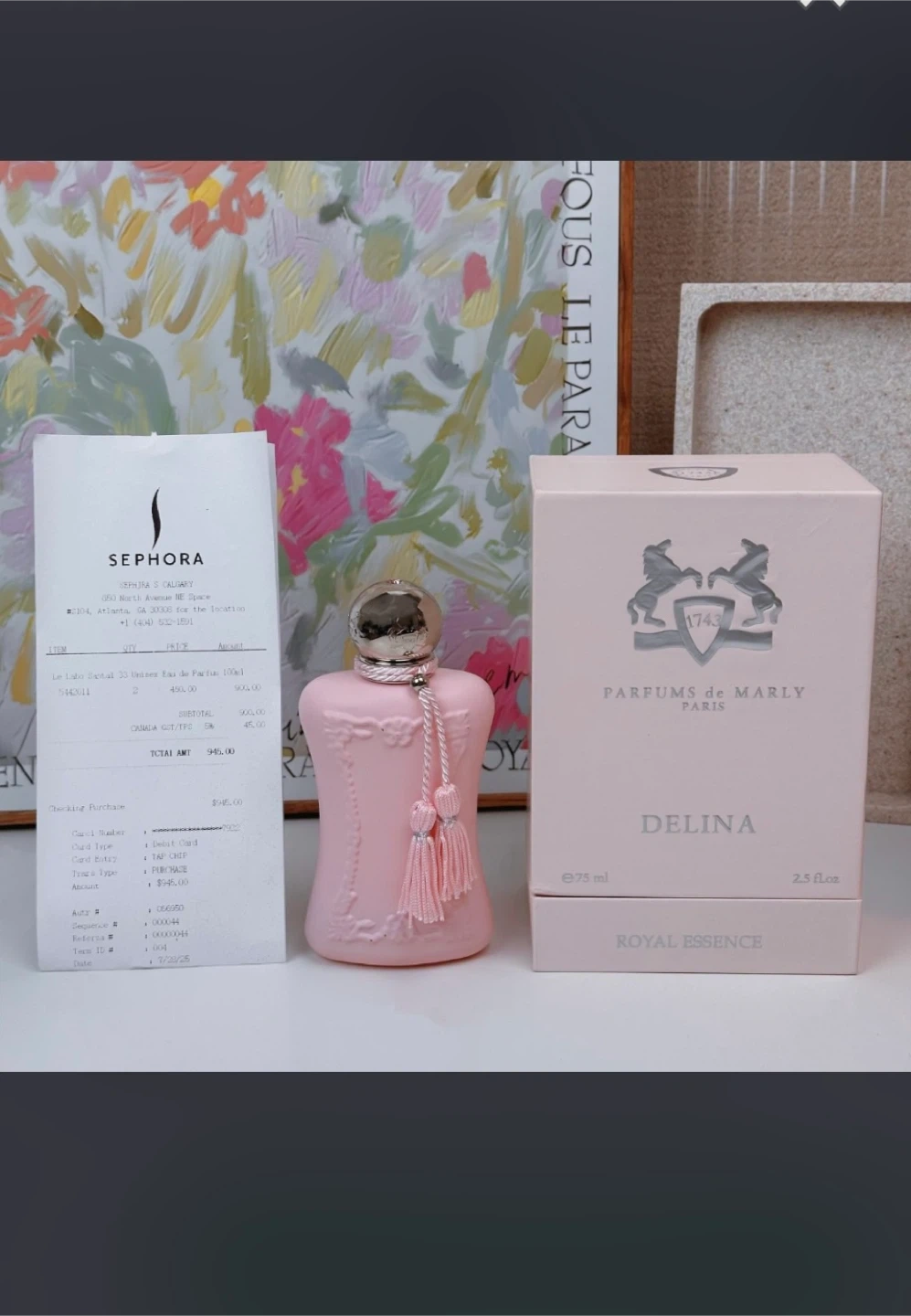 Selling a bottle of Parfums de Marly Delina, 75ml. It comes with the original box. The receipt shows it was originally bought for $345.00. This Royal Essence fragrance is perfect for anyone looking for a luxurious scent