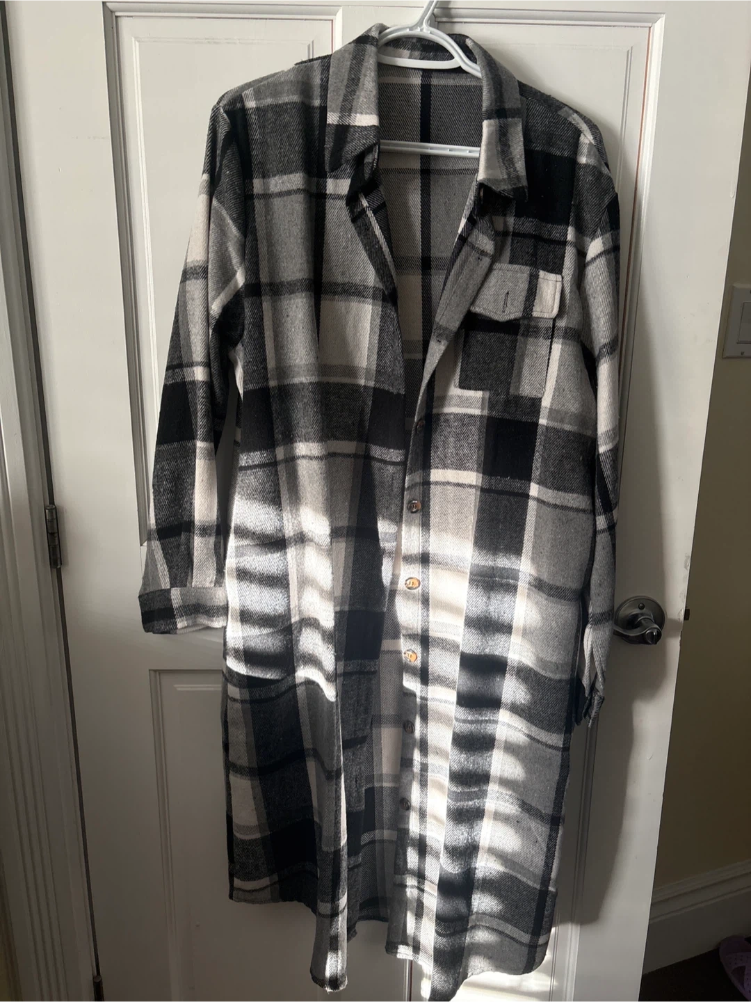 Selling a cozy plaid flannel shacket! It features a long lapel and button-down design, perfect for fall fashion. This casual long-sleeve trench coat style is great for layering. It's in excellent condition and ready for a new wardrobe!