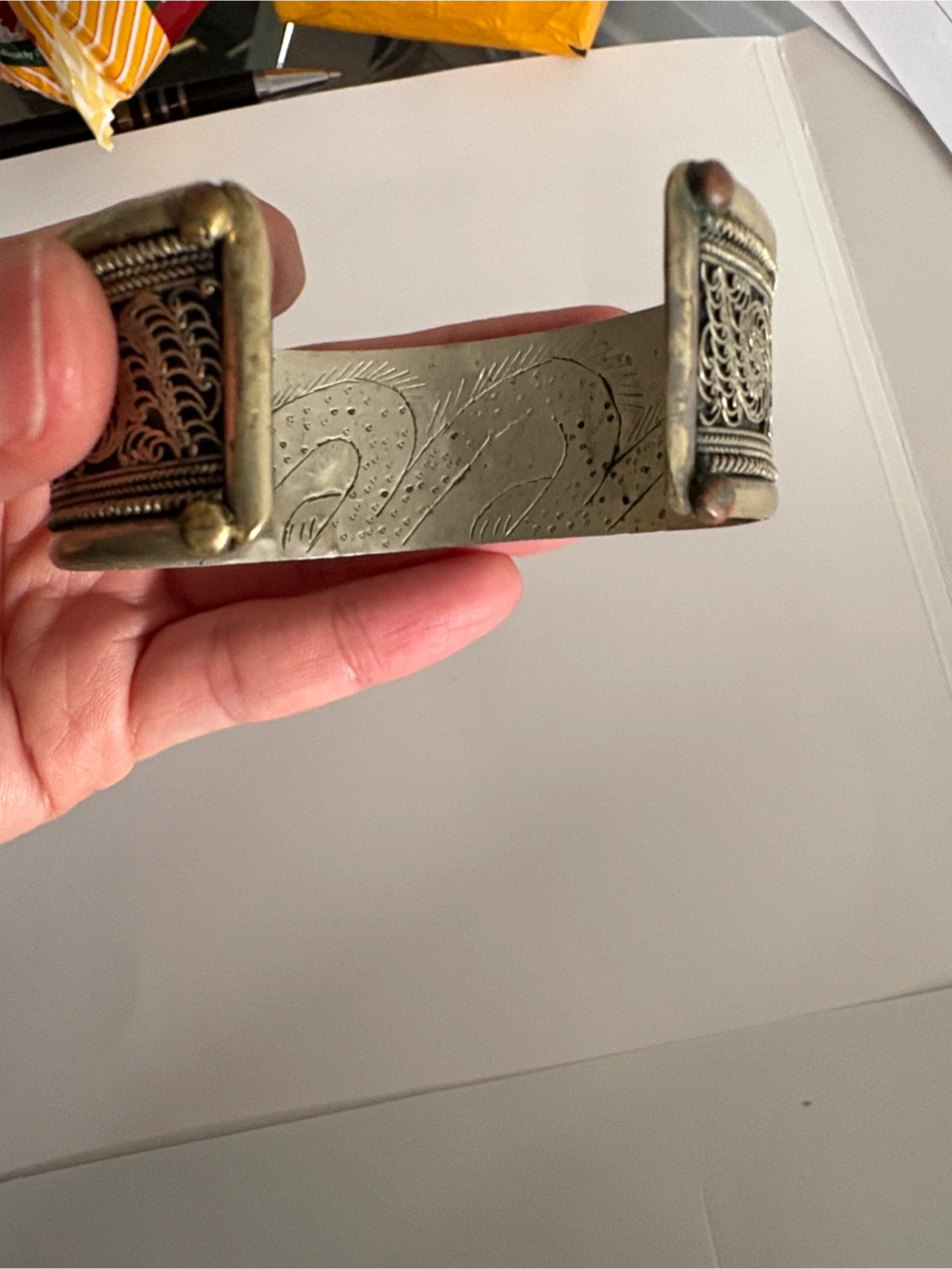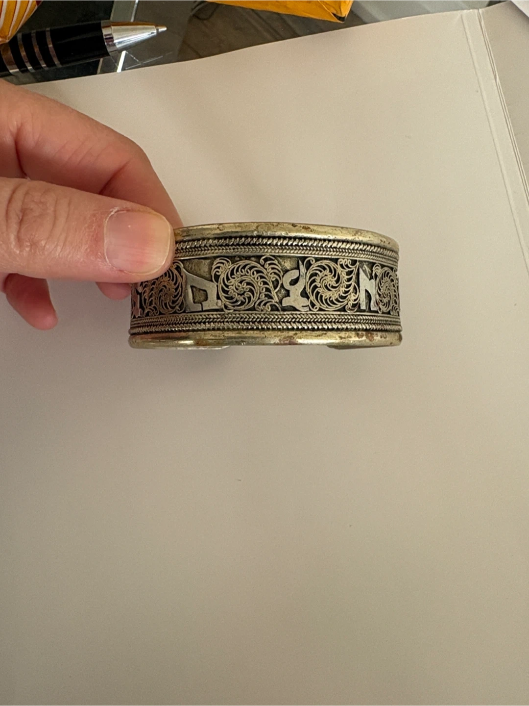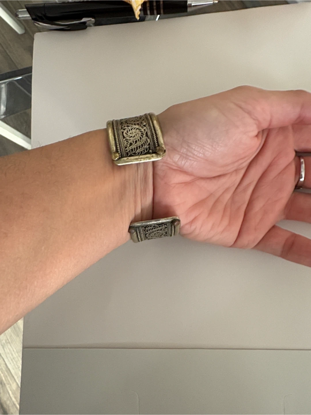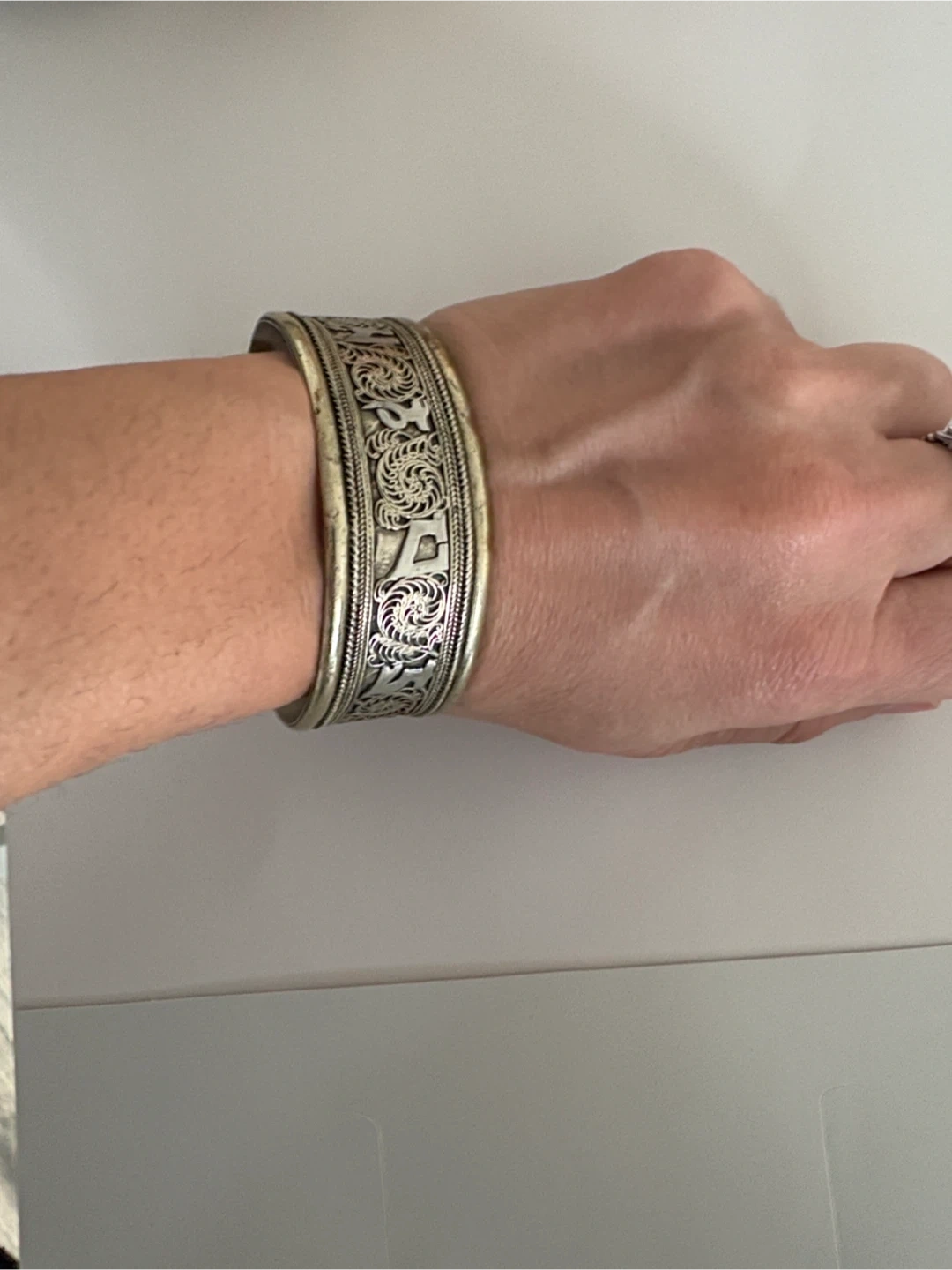 Selling a unique vintage antique cuff bracelet with intricate silver-tone detailing. It has a beautiful, ornate design and is in good condition. Perfect for adding a touch of vintage charm to any outfit!