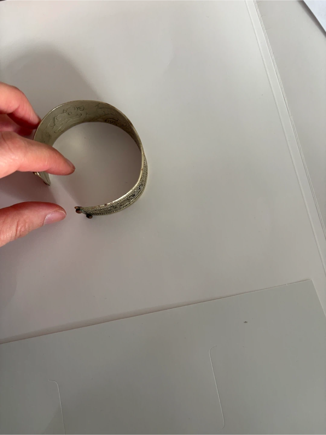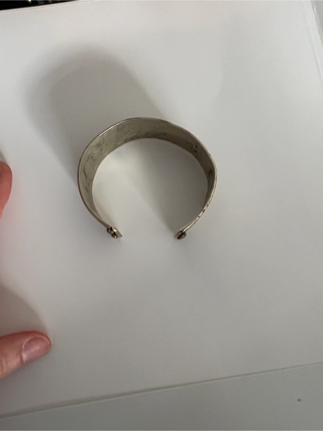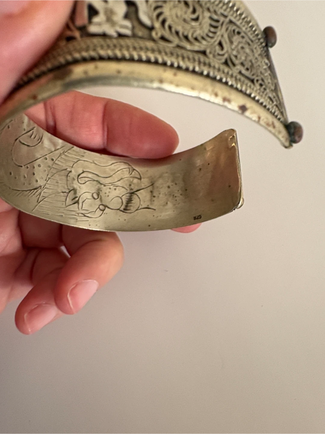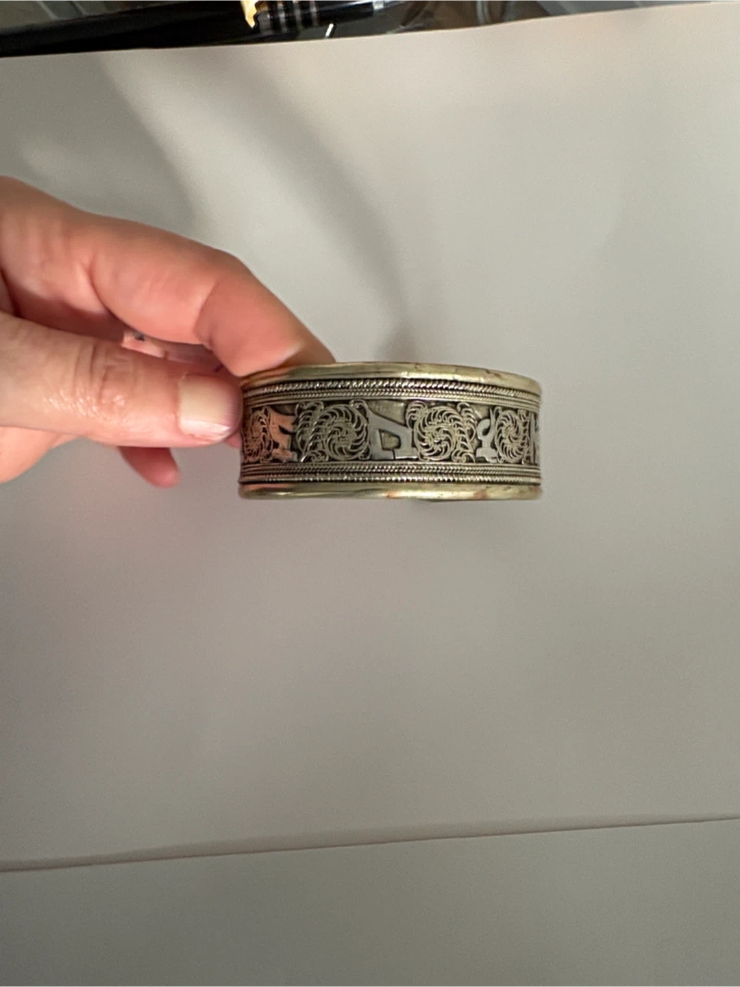 Selling a unique vintage antique cuff bracelet with intricate silver-tone detailing. It has a beautiful, ornate design and is in good condition. Perfect for adding a touch of vintage charm to any outfit!