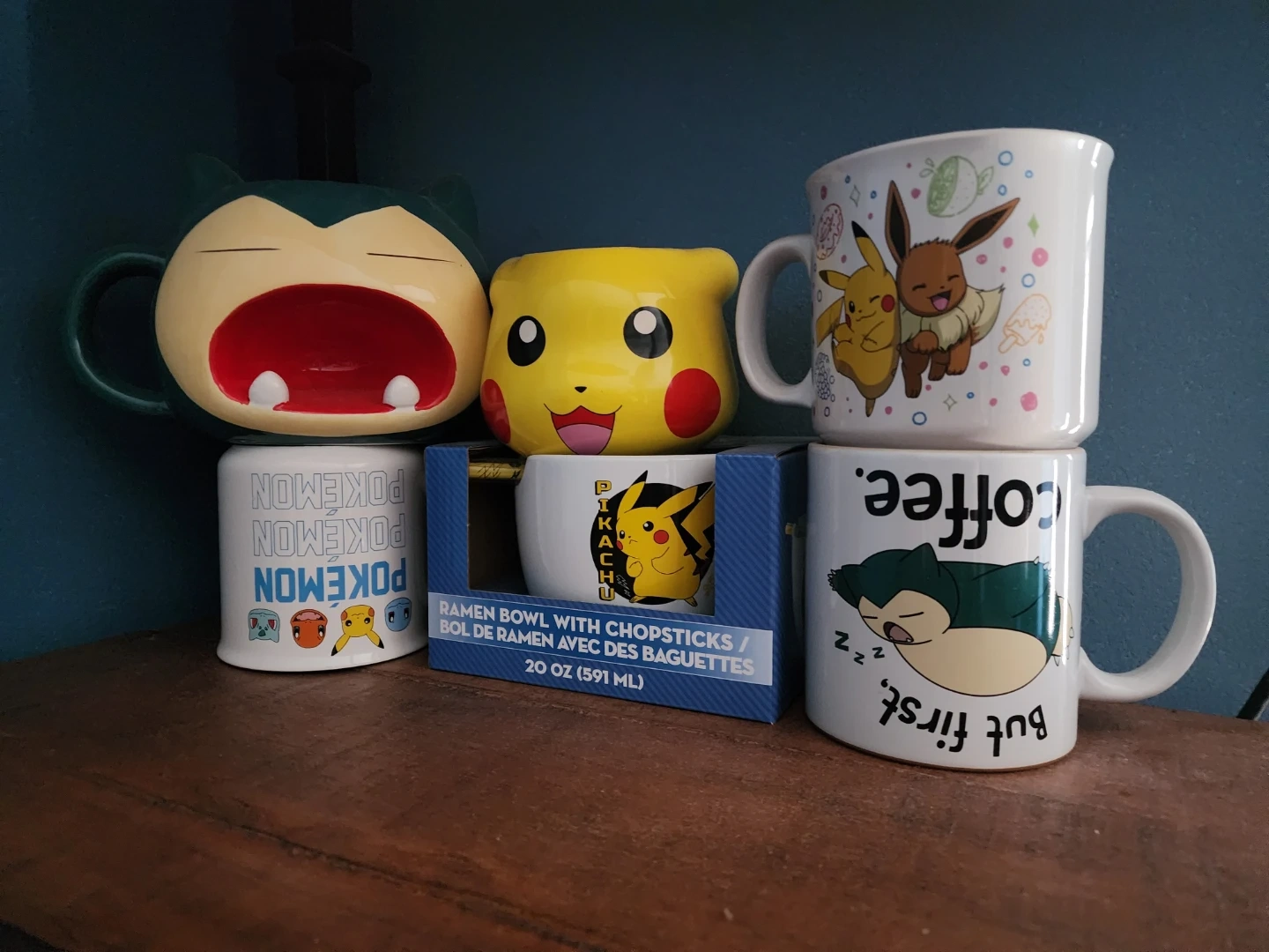 There's a Snorlax mug, a Pikachu mug, and an Eevee & Pikachu mug. The ramen bowl set also features Pikachu and comes with chopsticks. The bowl is 20 oz (591 ml). Great for any Pokémon fan!