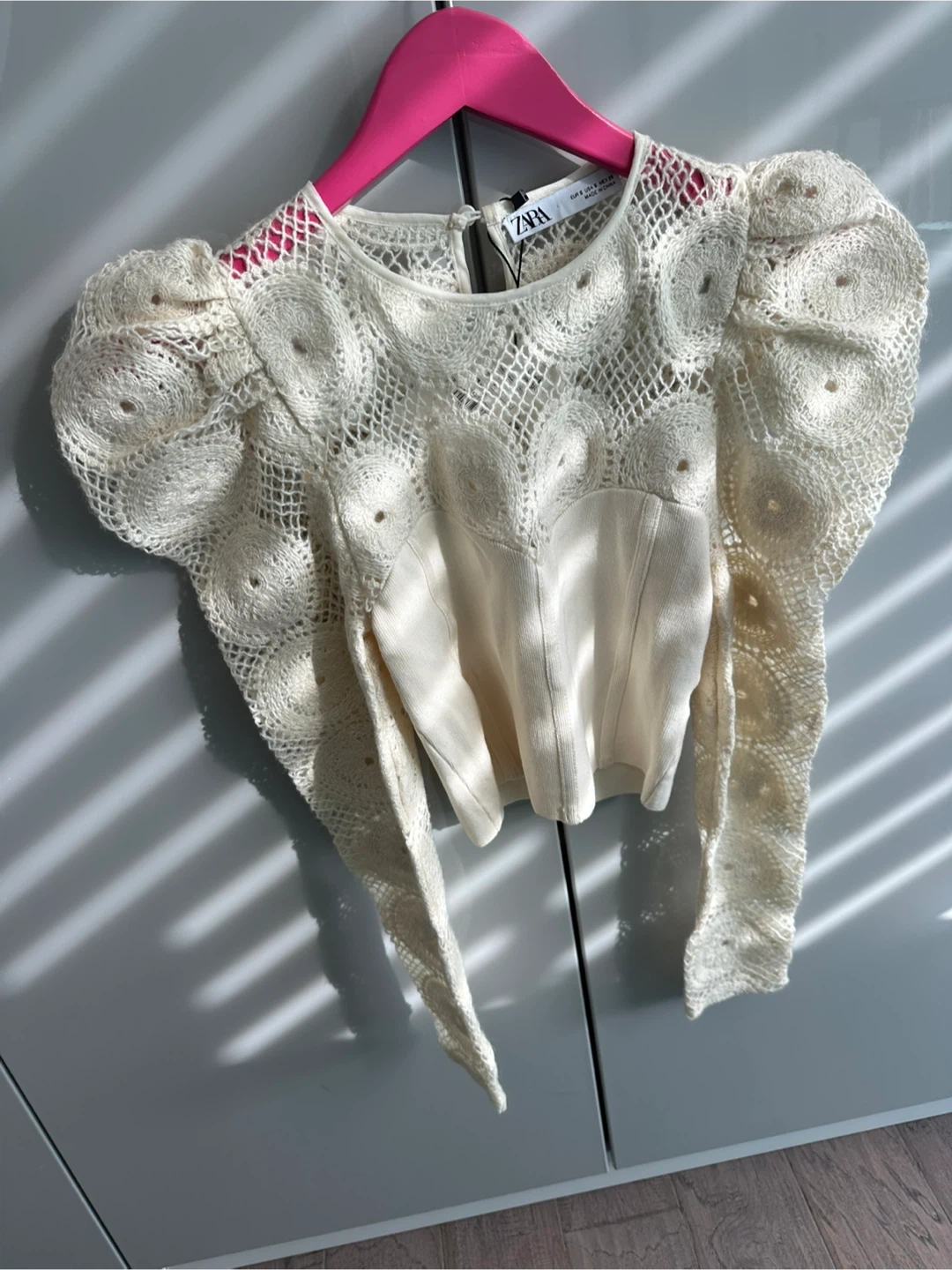 This is a beautiful Zara crochet knit top in a size small. It has a unique design and is perfect for adding a touch of elegance to any outfit. Originally bought for $79.90!