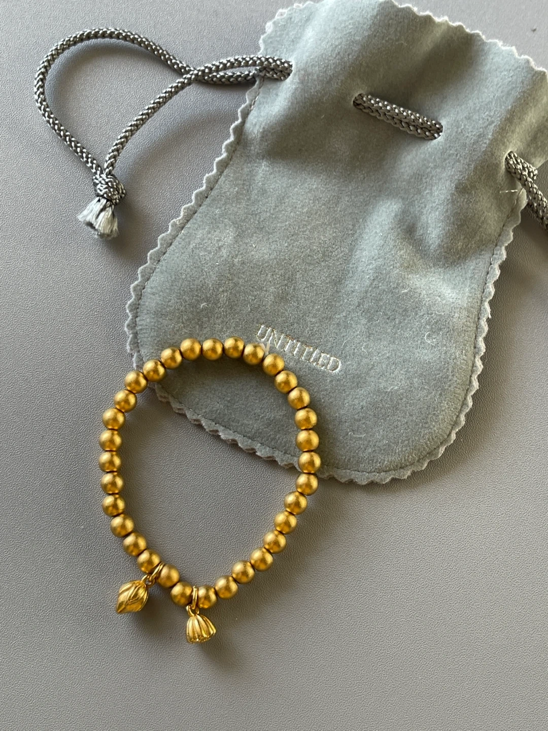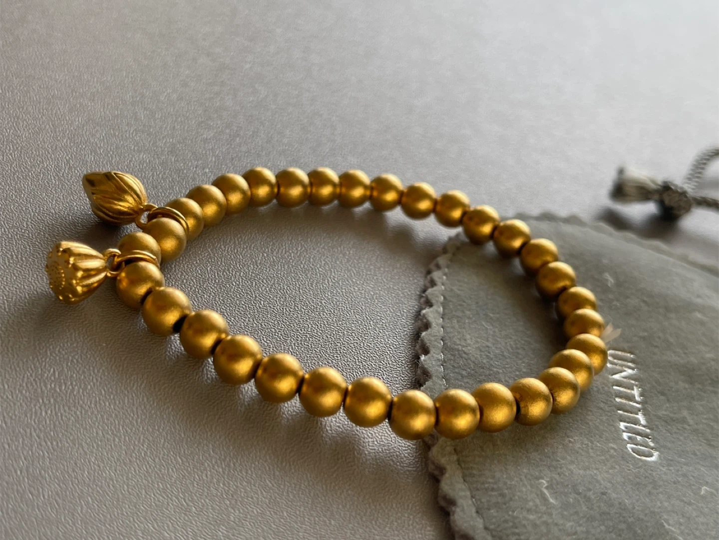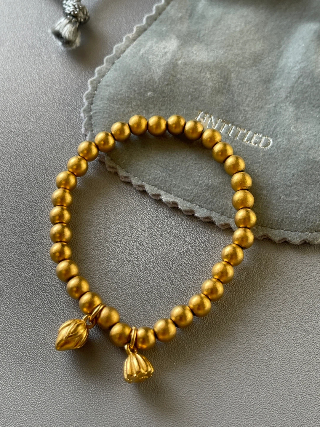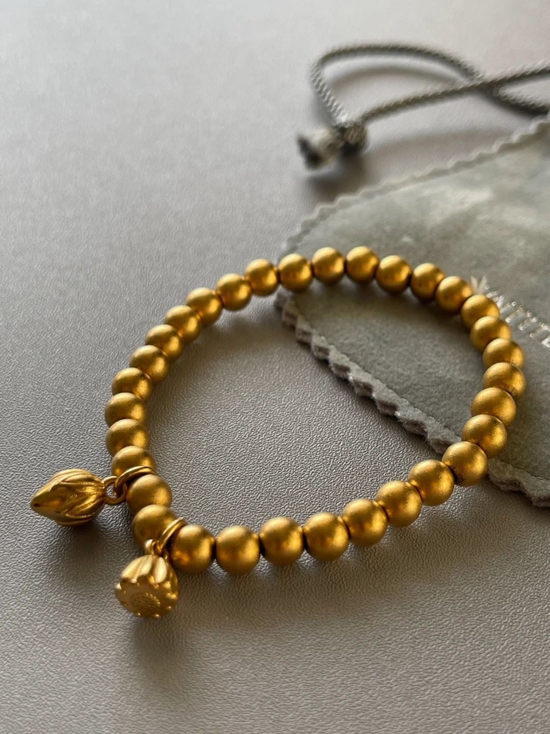 It features delicate lotus charms and comes with its original pouch. A lovely piece to add a touch of elegance to any outfit!