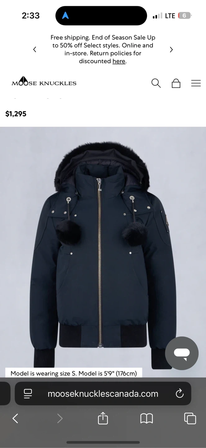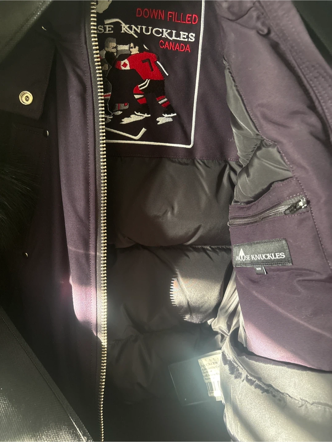 Selling a Moose Knuckles down-filled bomber jacket in size small. It comes with a bag for storage. The jacket features a stylish design with fur trim and detailed accents. Perfect for staying warm and fashionable during the colder months