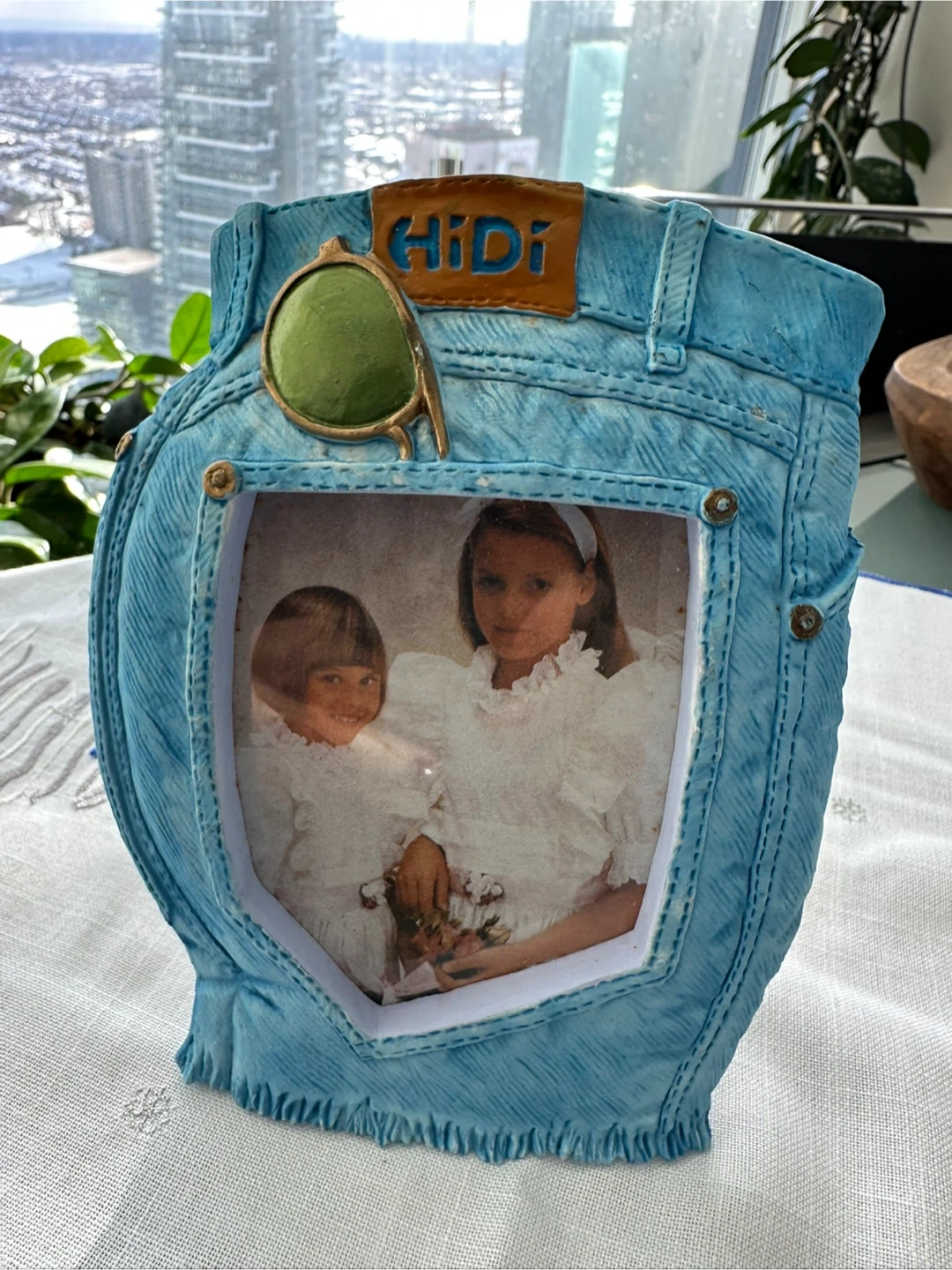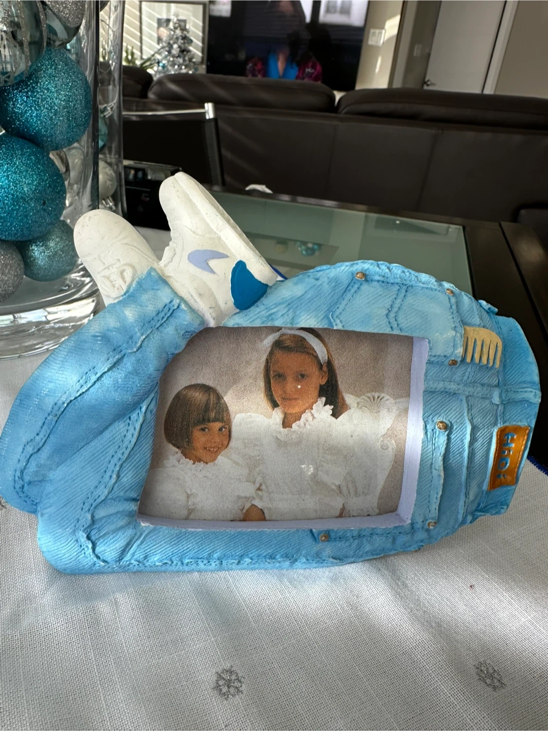 Selling a collection of picture frames. There's an Olivia & Graecie frame (3.5" x 3.5"), a Boutique Collection 'Princess' frame (5" x 5"), and a HiDi frame shaped like denim jeans. $5 each