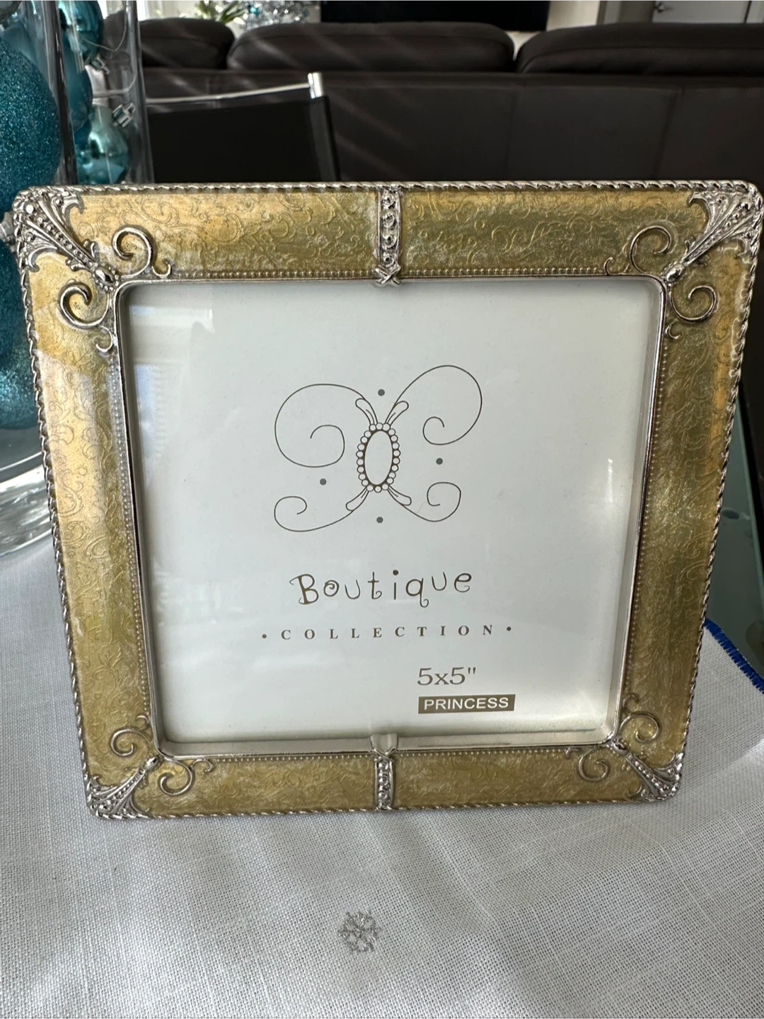 Selling a collection of picture frames. There's an Olivia & Graecie frame (3.5" x 3.5"), a Boutique Collection 'Princess' frame (5" x 5"), and a HiDi frame shaped like denim jeans. $5 each