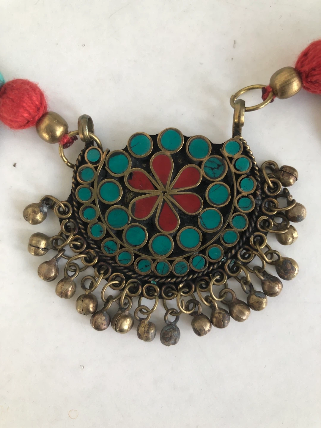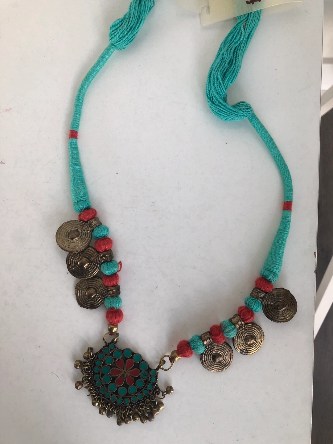 A beautiful Fabindia necklace featuring turquoise and red accents! It's a unique piece that will add a pop of colour to any outfit. Check out my other postings for combo deals and great discounts.