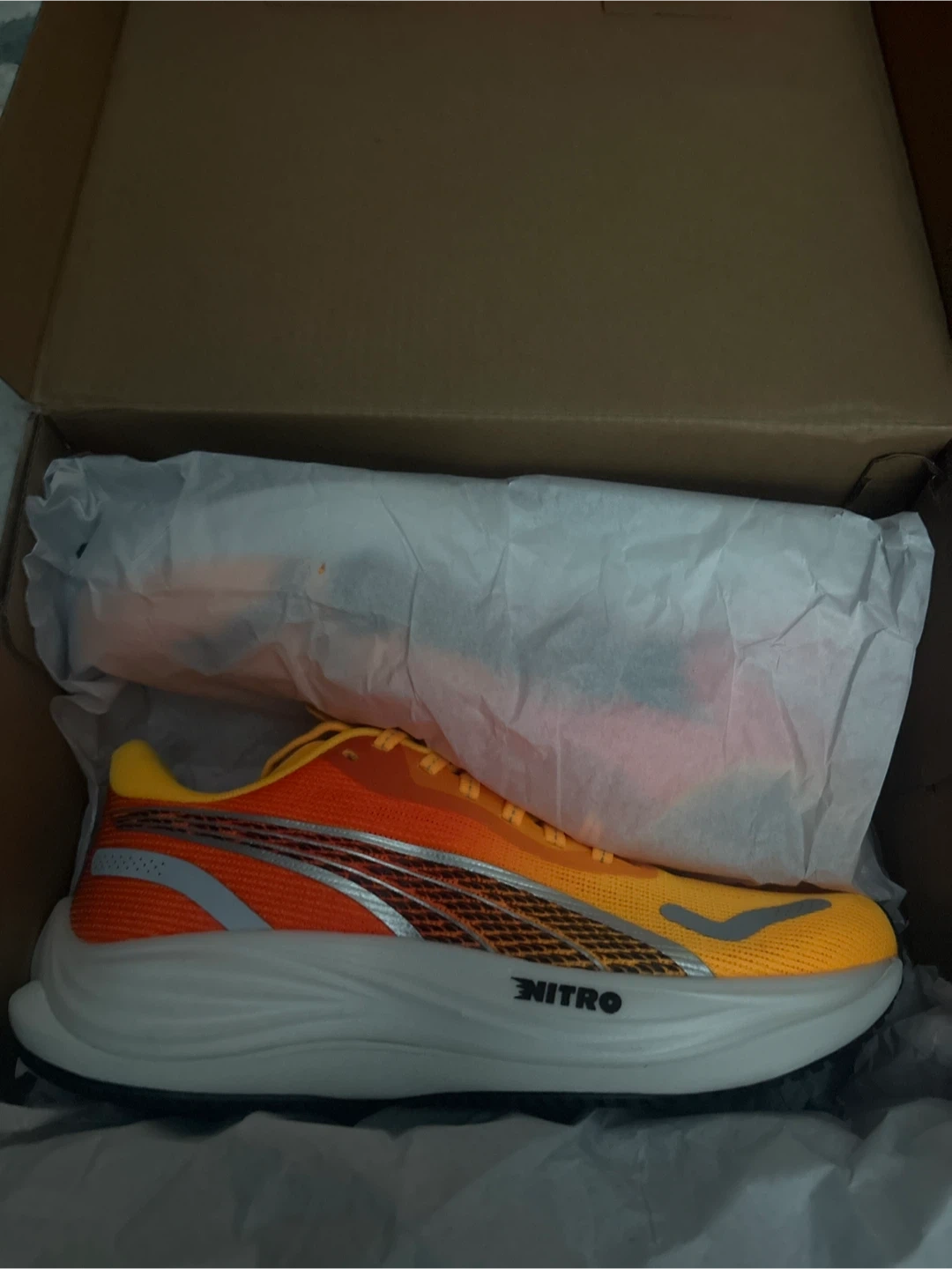 Selling a pair of Puma Velocity Nitro 3 women's running shoes in size 6.5 & 8.5 US. The colour is sun stream-sunset glow-white. They come with the original box